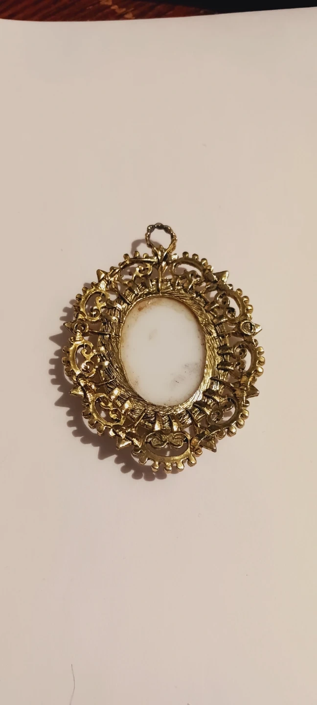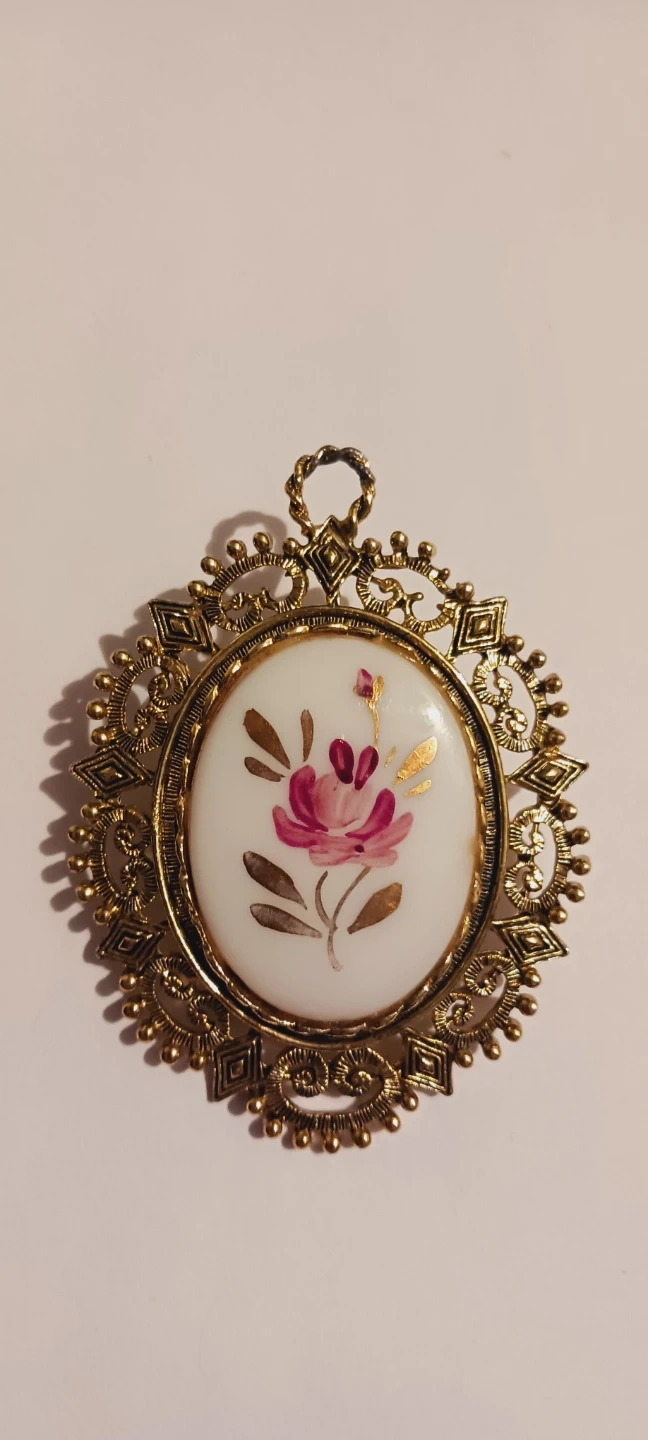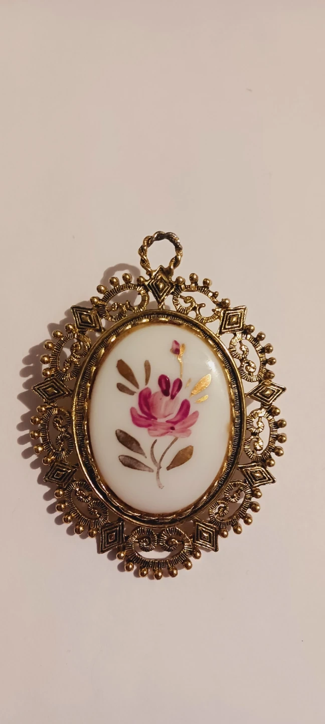 This pendant features a hand-painted floral design on a white oval insert. It's set in an ornate gold-tone metal frame with decorative scrollwork and bead details. The piece has a loop at the top for hanging. Excellent condition. 3"×2". ALL MY PRICES ARE NEGOTIABLE !!