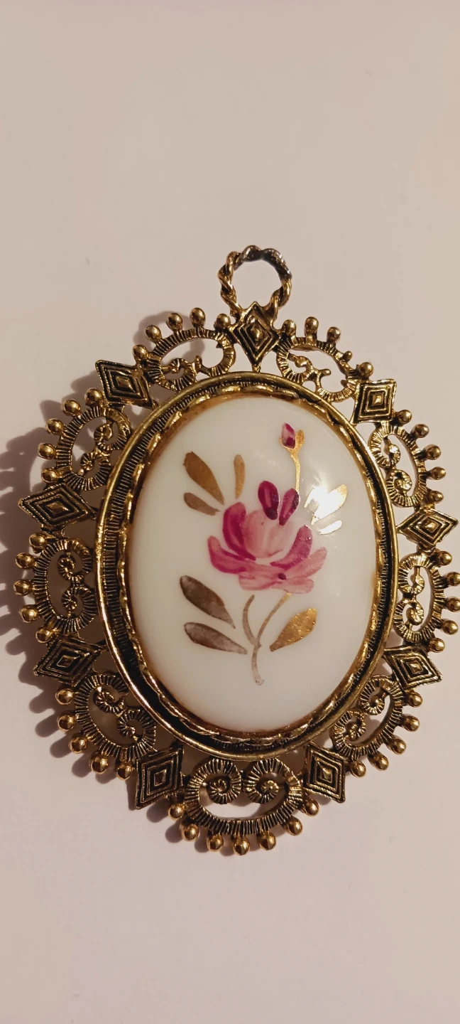 This pendant features a hand-painted floral design on a white oval insert. It's set in an ornate gold-tone metal frame with decorative scrollwork and bead details. The piece has a loop at the top for hanging. Excellent condition. 3"×2". ALL MY PRICES ARE NEGOTIABLE !!