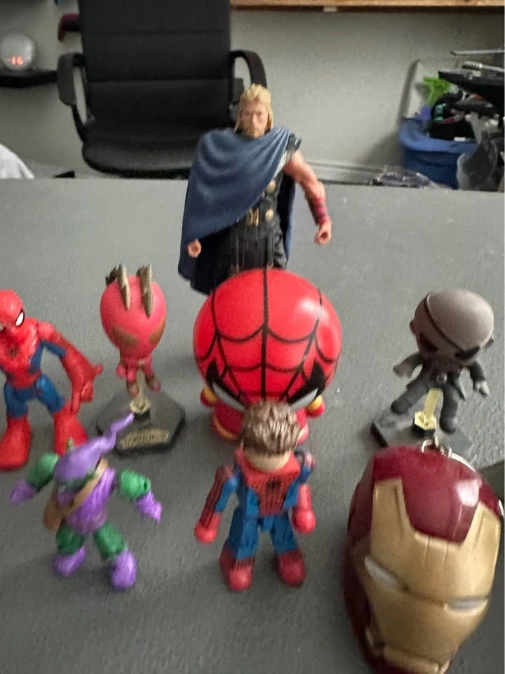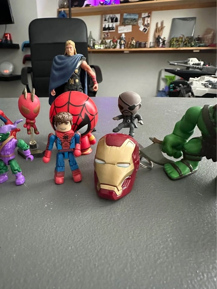 Lot of mini figures, around 2 inches tall. Thor is the tallest at about 3.5 inches. Includes Spiderman, Nick Fury, Thor, Hulk, Sandman, Hobgoblin, and an Iron Man helmet keychain. $5 for all. Pickup in Brampton.