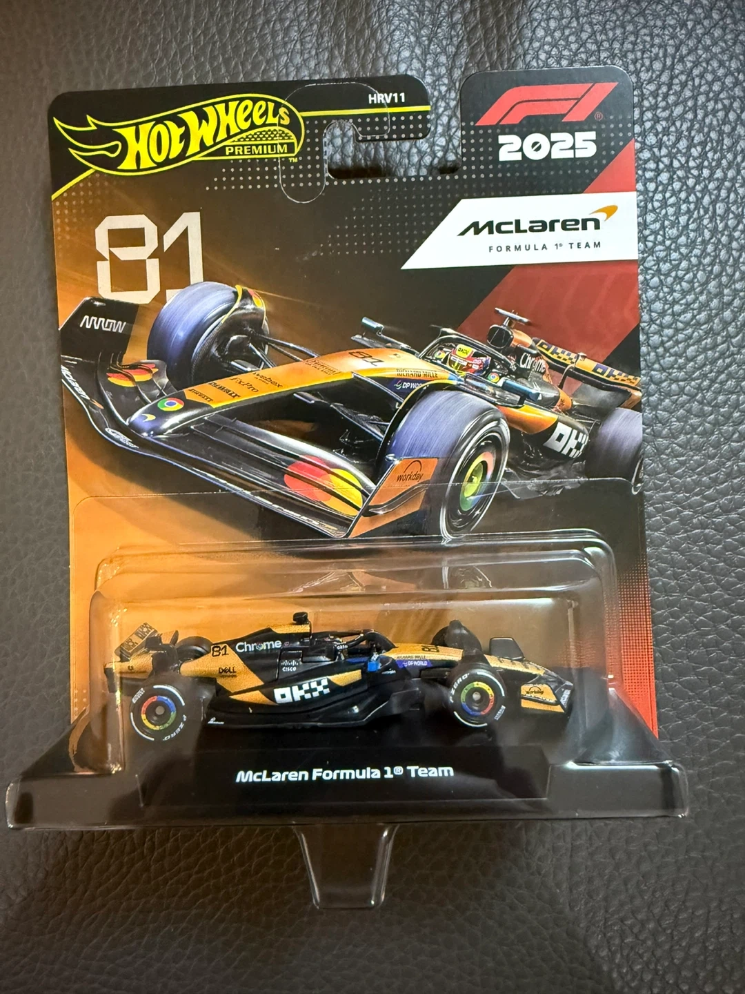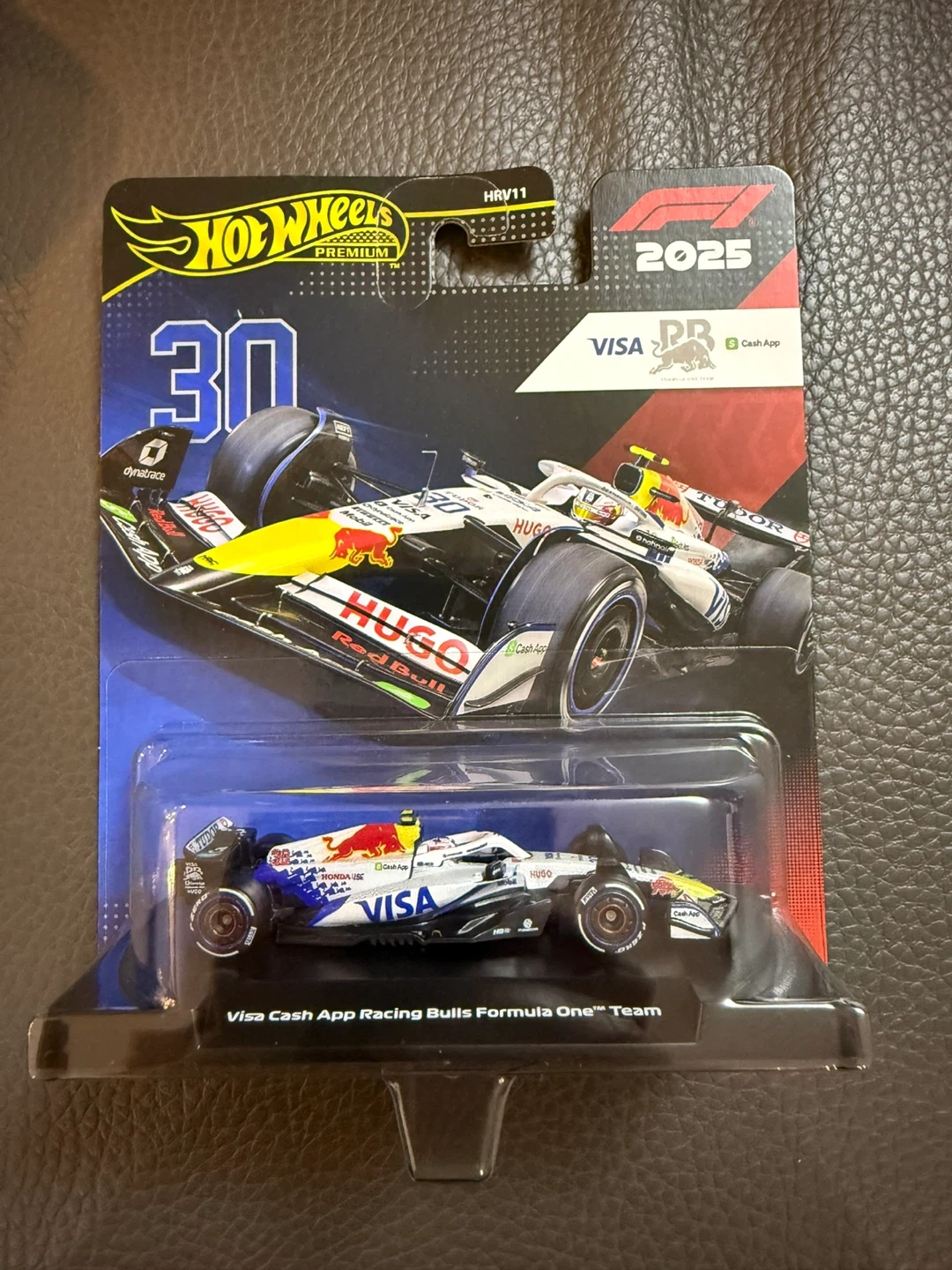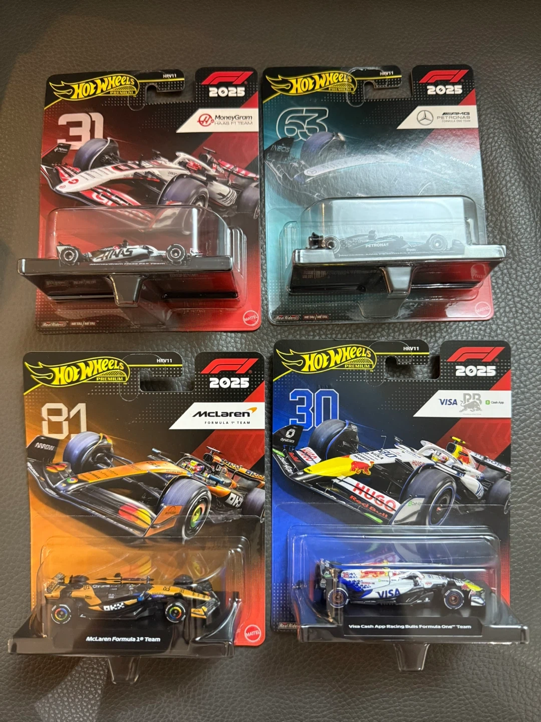 Four Hot Wheels Premium diecast cars featuring Formula 1 teams. Includes Mercedes-AMG Petronas, MoneyGram Haas, McLaren, and Visa Cash App RB. Brand new in original packaging!