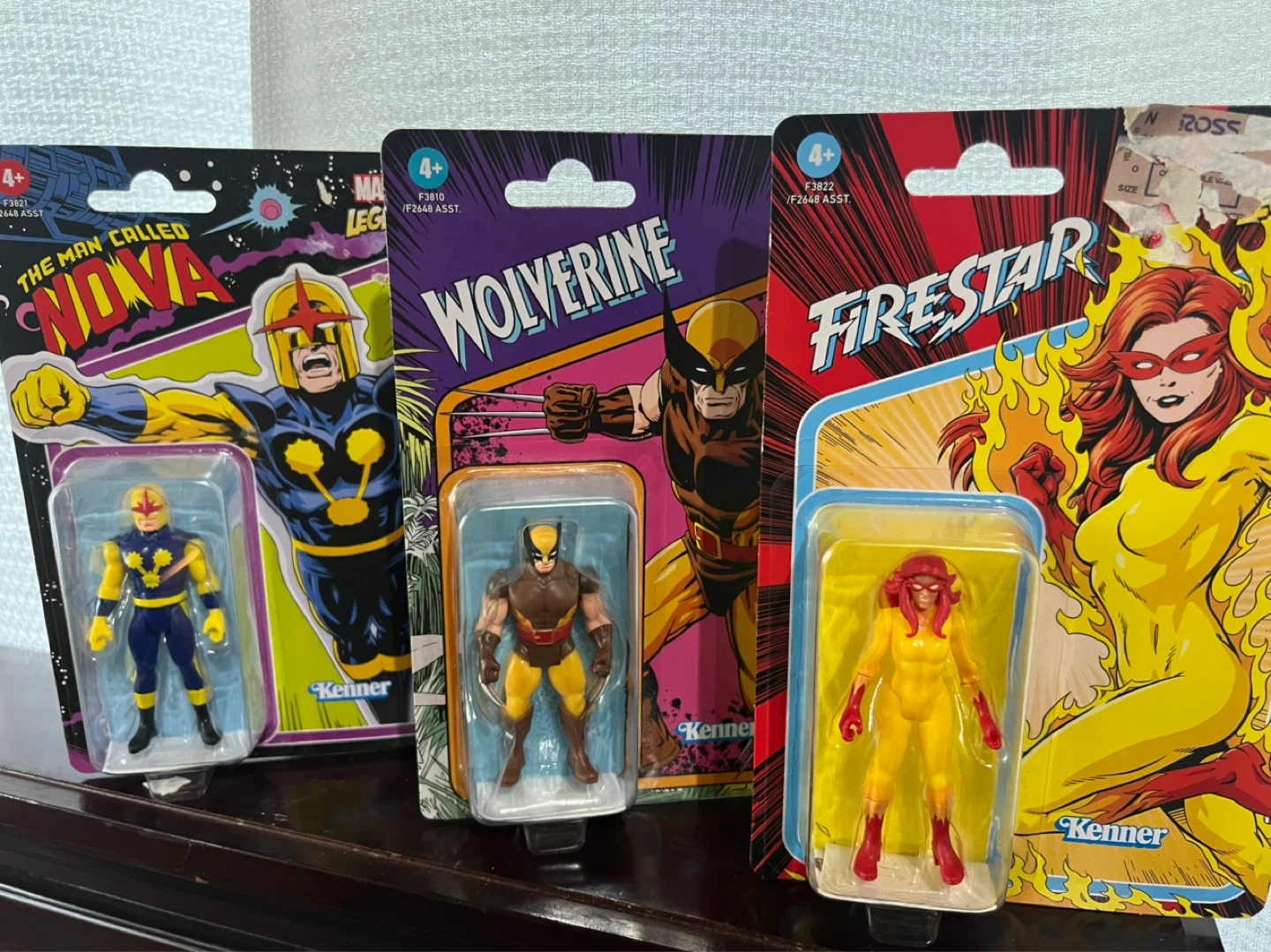 Includes three Marvel Legends retro action figures: Nova, Wolverine, and Firestar. Each figure comes in its original retro-style packaging. Figures are recommended for ages 4 and up.