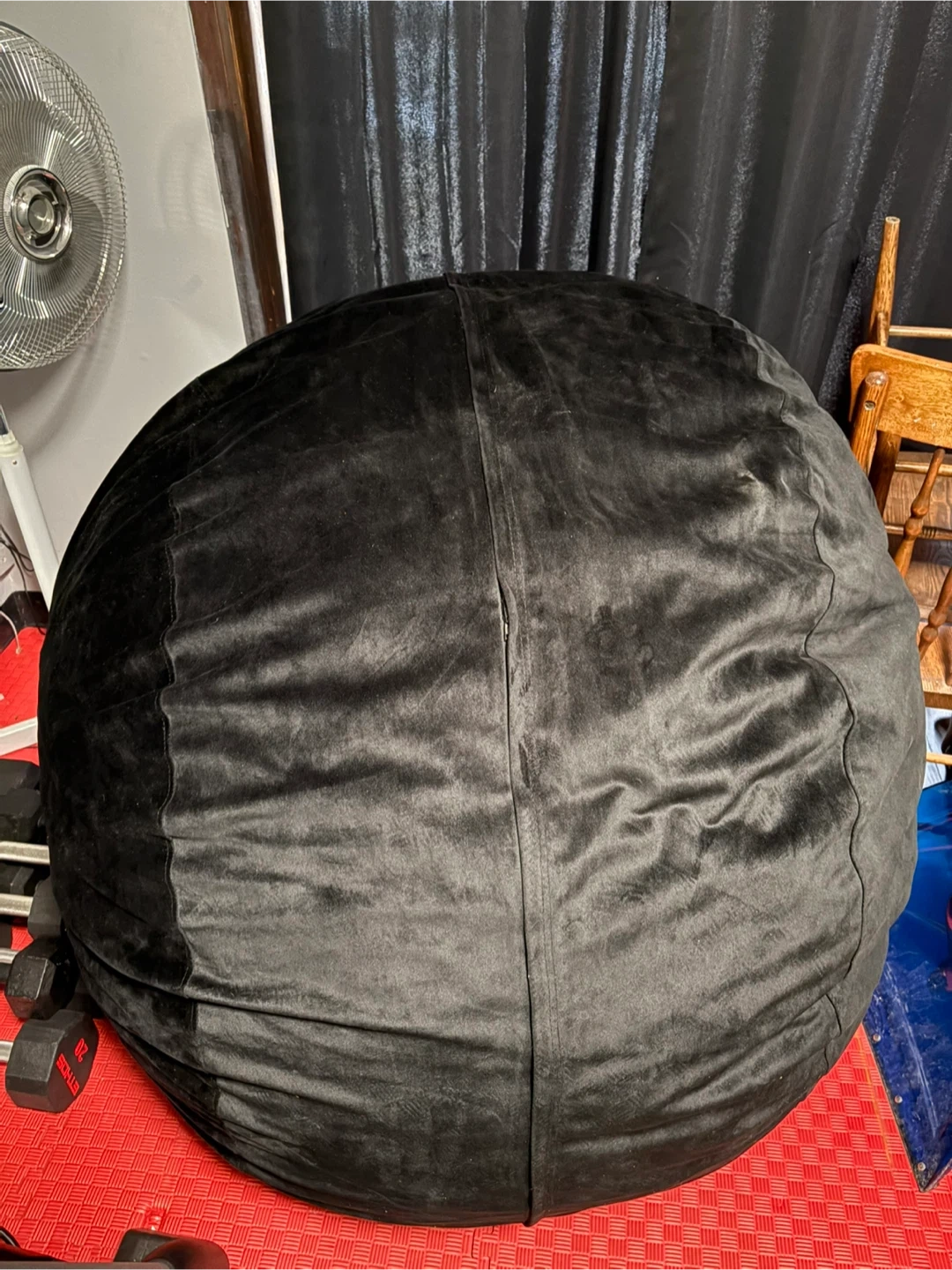 This is a large, round bean bag chair in a soft black velvet material. It's perfect for lounging or gaming. The cover is durable and comfortable.