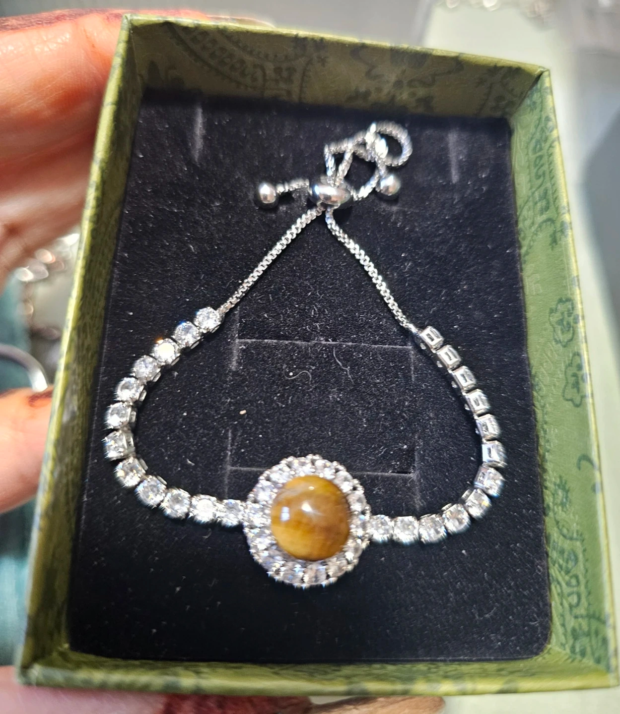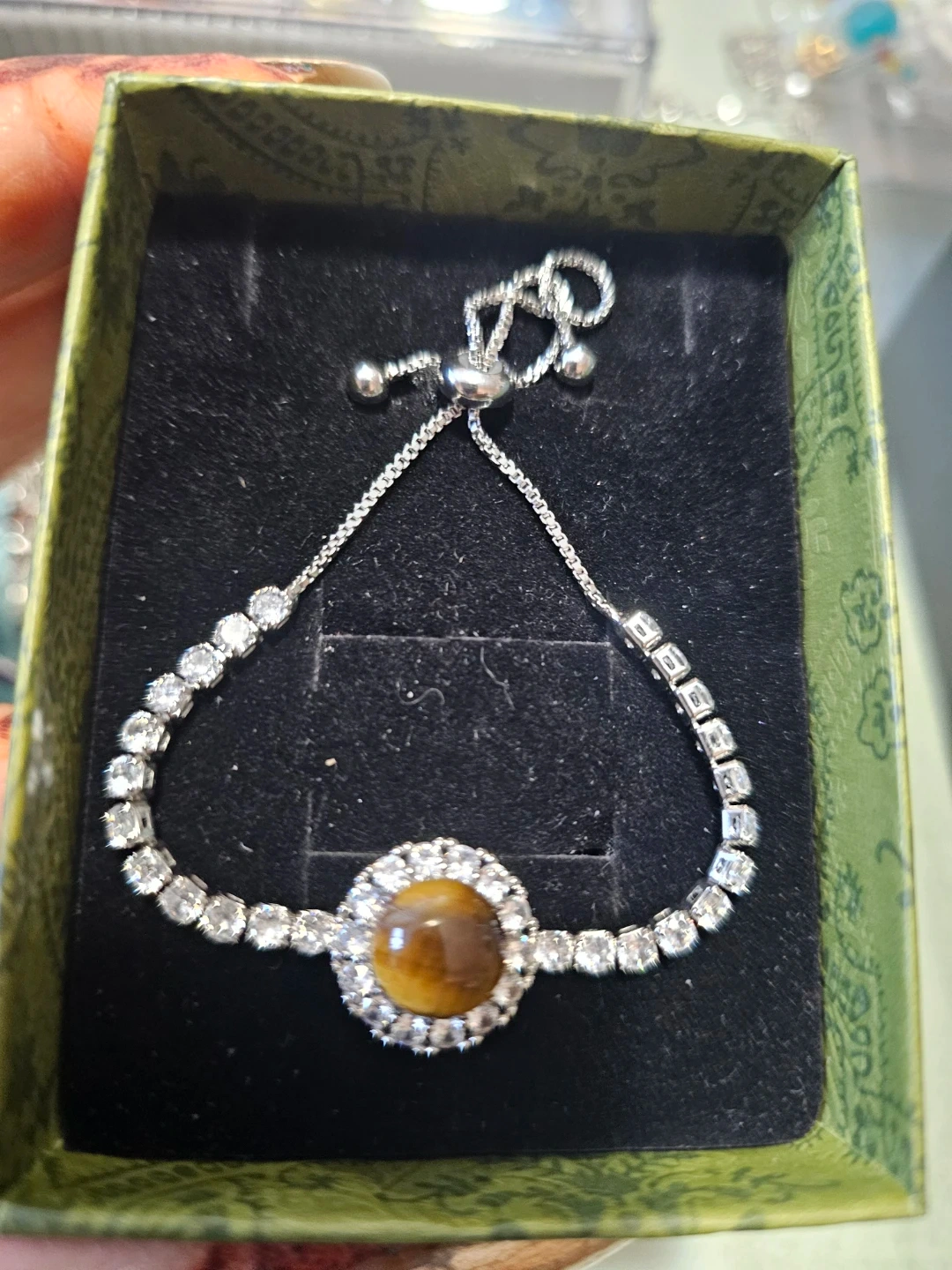 Here's a lovely silver bracelet featuring a central tiger eye stone surrounded by smaller clear stones. It comes in its original box and is in great condition!
