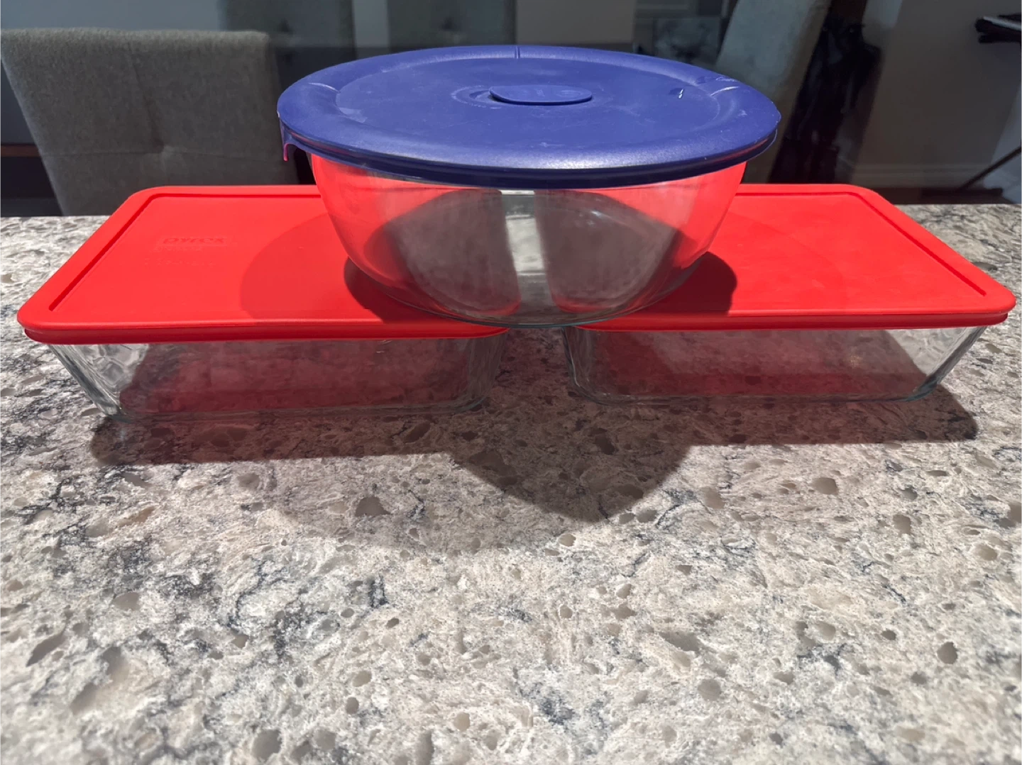 Set of Pyrex glass food storage containers. Includes two rectangular dishes with red lids and one round bowl with a blue lid. Great for leftovers or meal prep!