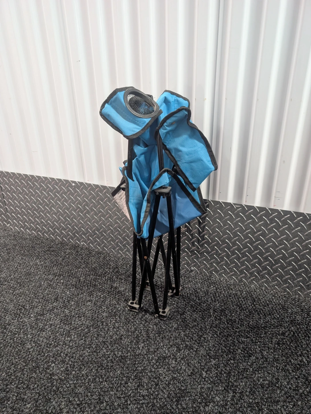 This is a blue folding camp chair for kids. It's made of fabric and metal. Features a built-in cup holder on one armrest. Perfect for outdoor events or camping trips!