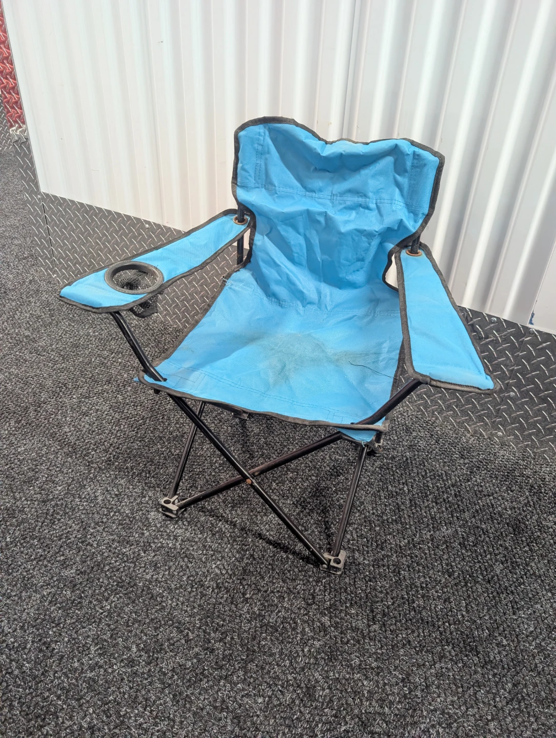 This is a blue folding camp chair for kids. It's made of fabric and metal. Features a built-in cup holder on one armrest. Perfect for outdoor events or camping trips!