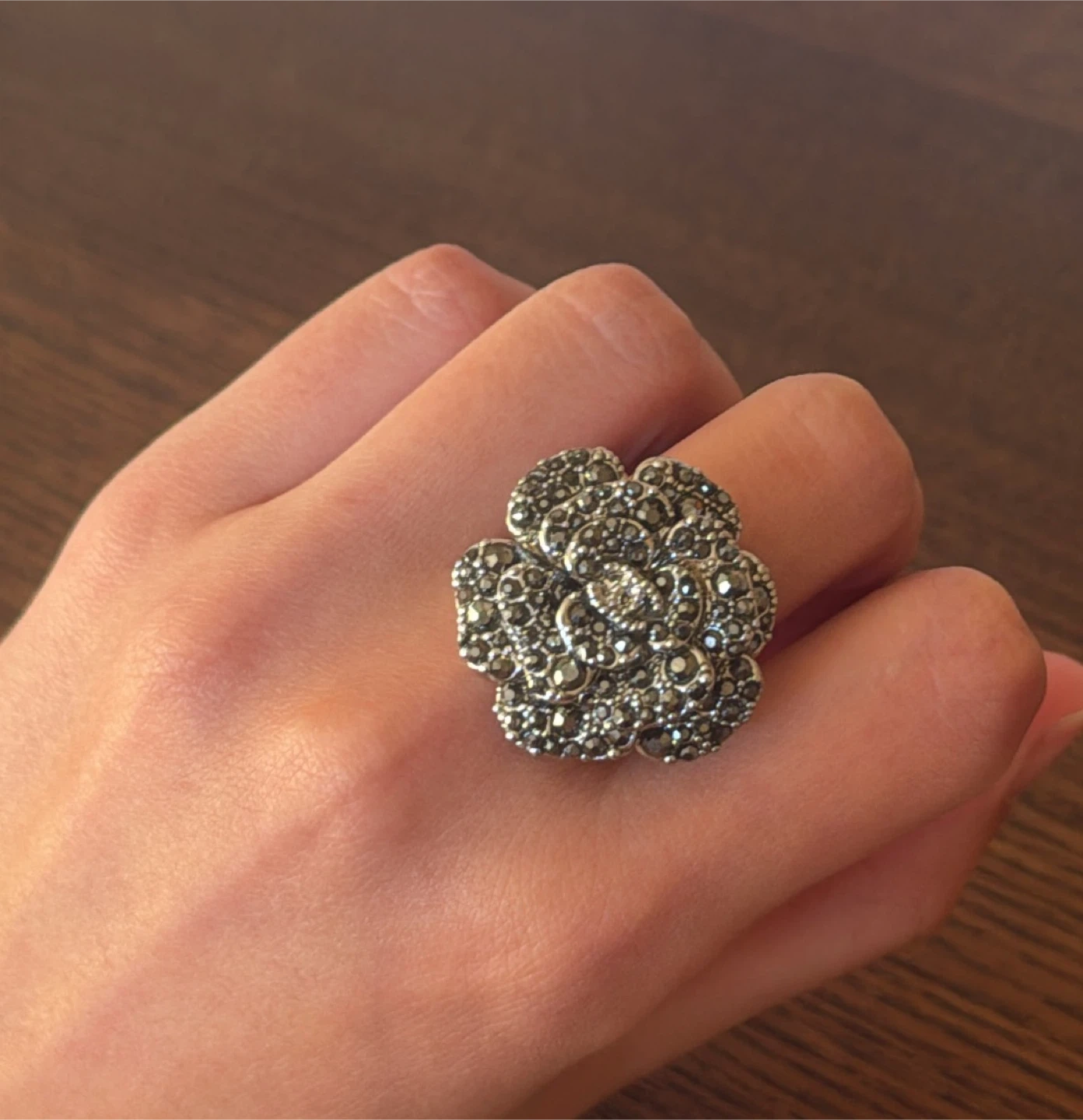 A beautiful Chanel ring designed with a floral cluster. It features marcasite and crystal accents for a sparkling look. This statement ring adds a touch of elegance to any outfit.