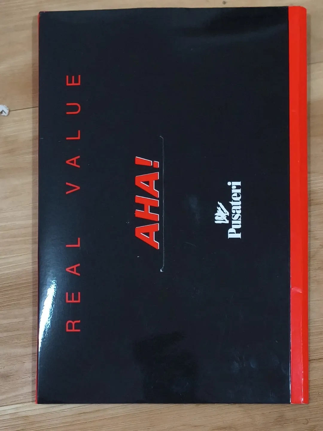 This is a Pusateri notebook with AHA! Real Value branding. It features a black cover with red lettering. The binding is red.