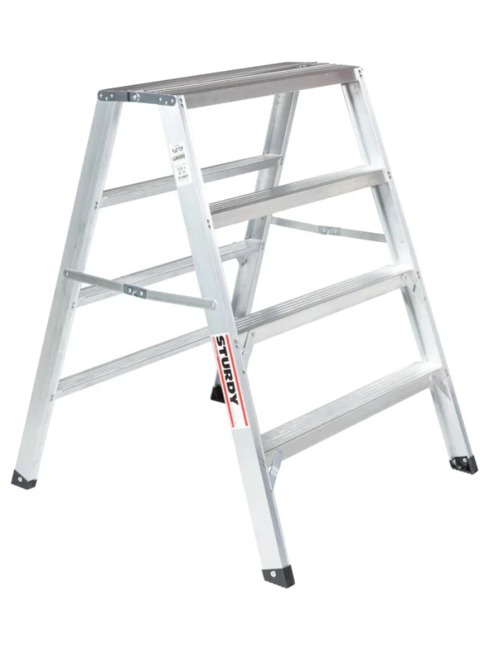 This is a Sturdy brand aluminum step stool ladder. It has a flat top platform and wide, non-slip steps. Lightweight and easy to carry around for tasks. It is in pristine condition and in storage.