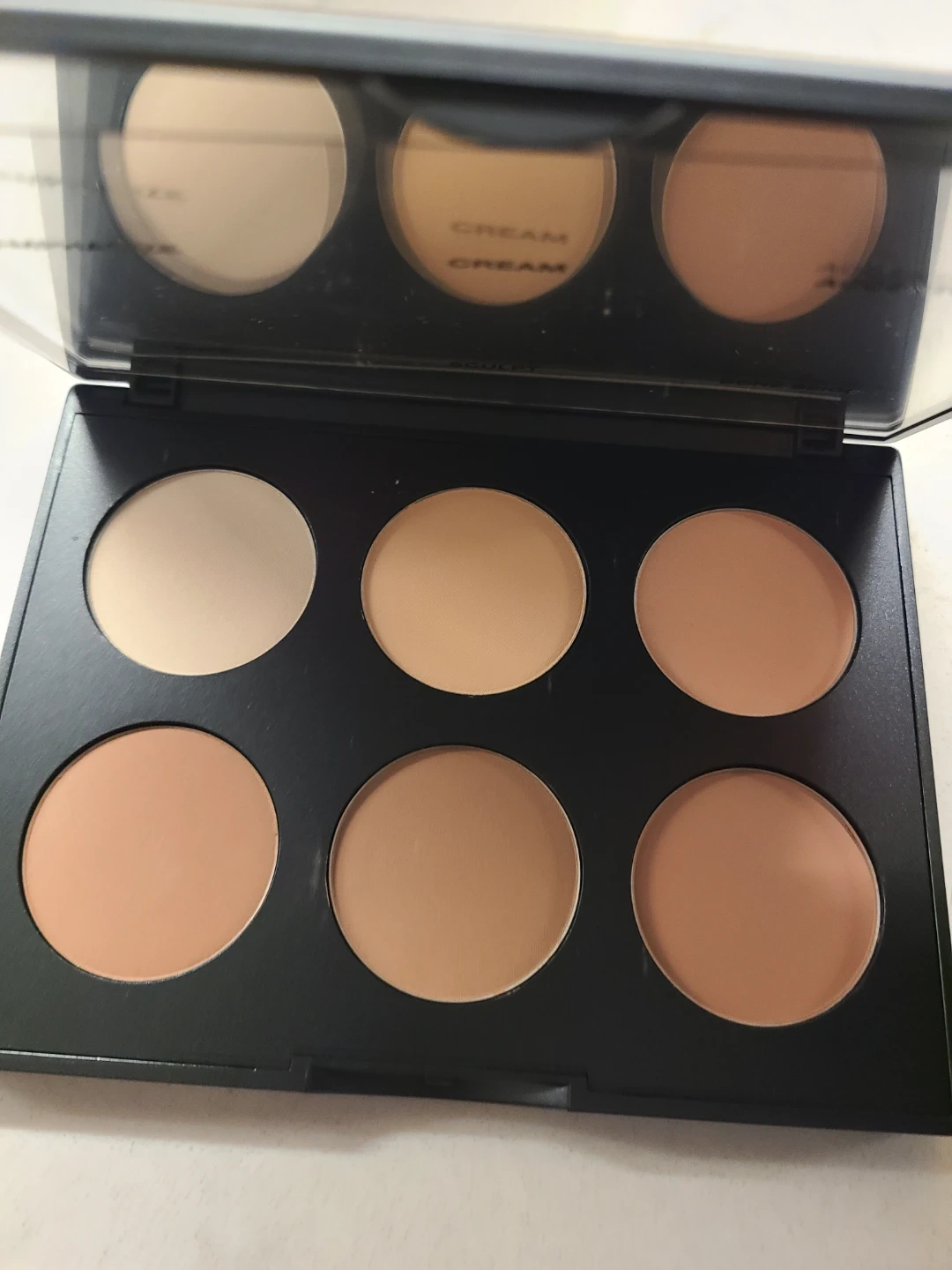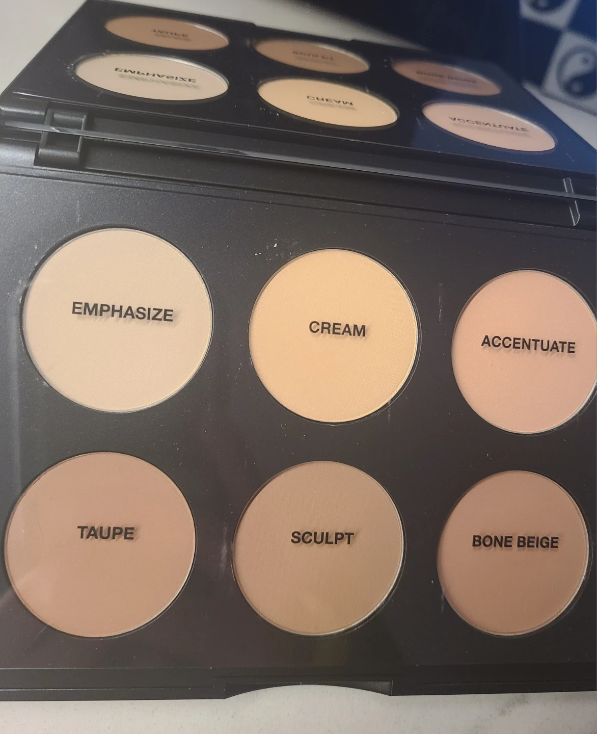 Light/Medium palette with 6 shades for contouring. Includes Emphasize, Cream, Accentuate, Taupe, Sculpt, and Bone Beige. Total net weight is 0.50 oz/14.4 g.
