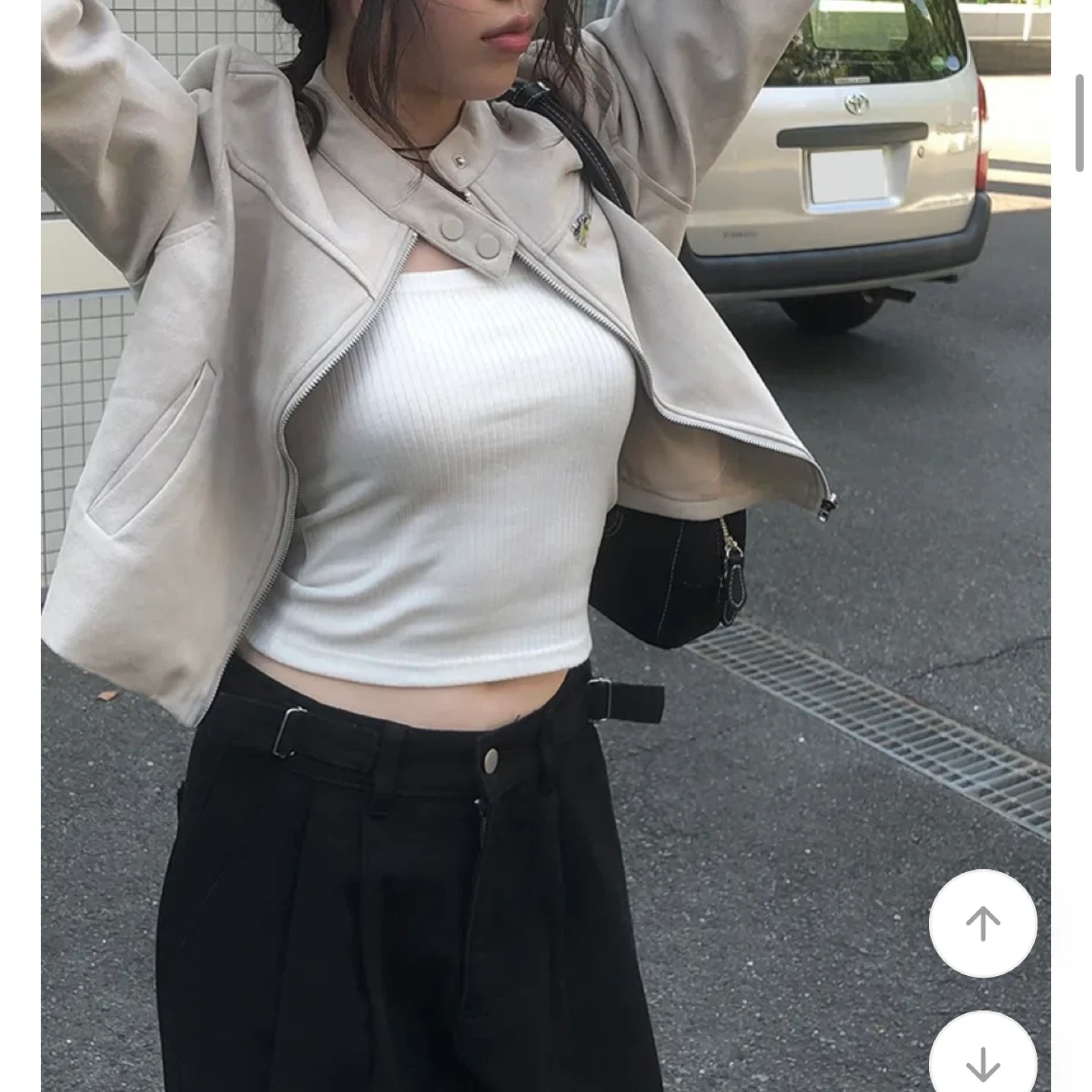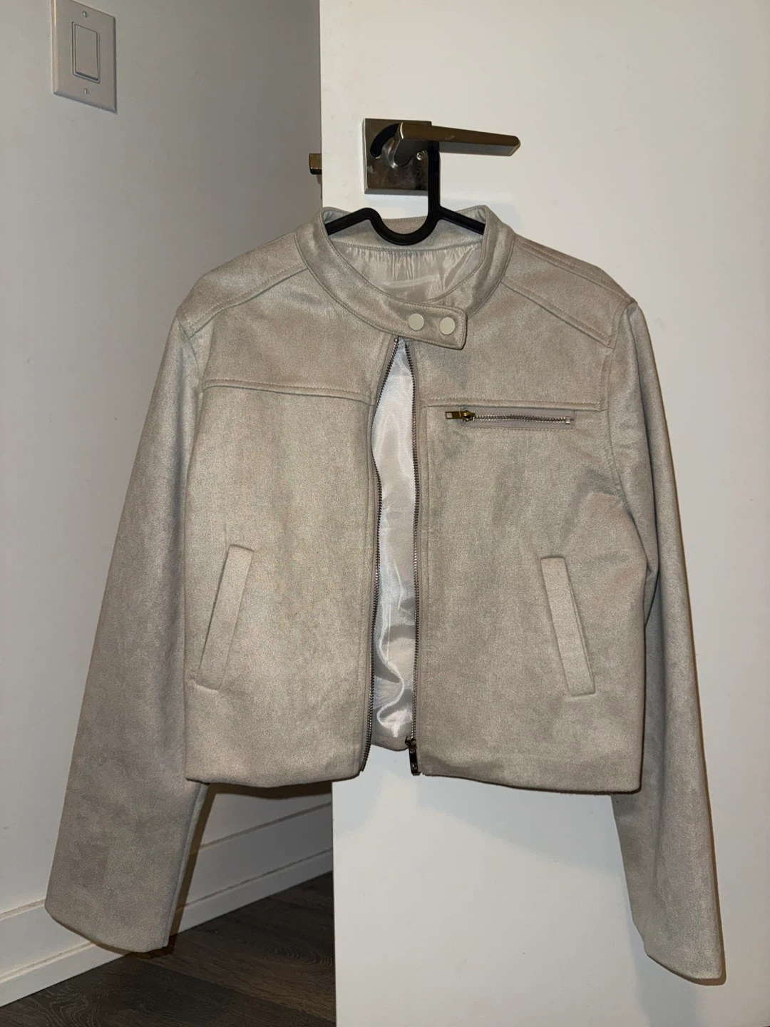 Selling a beige cropped biker jacket! It's in great condition and has a stylish, modern look. Perfect for layering or wearing on its own during milder weather