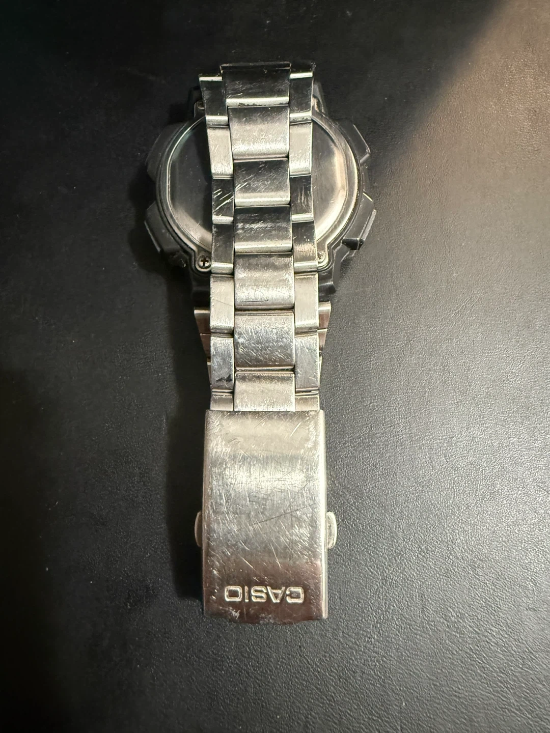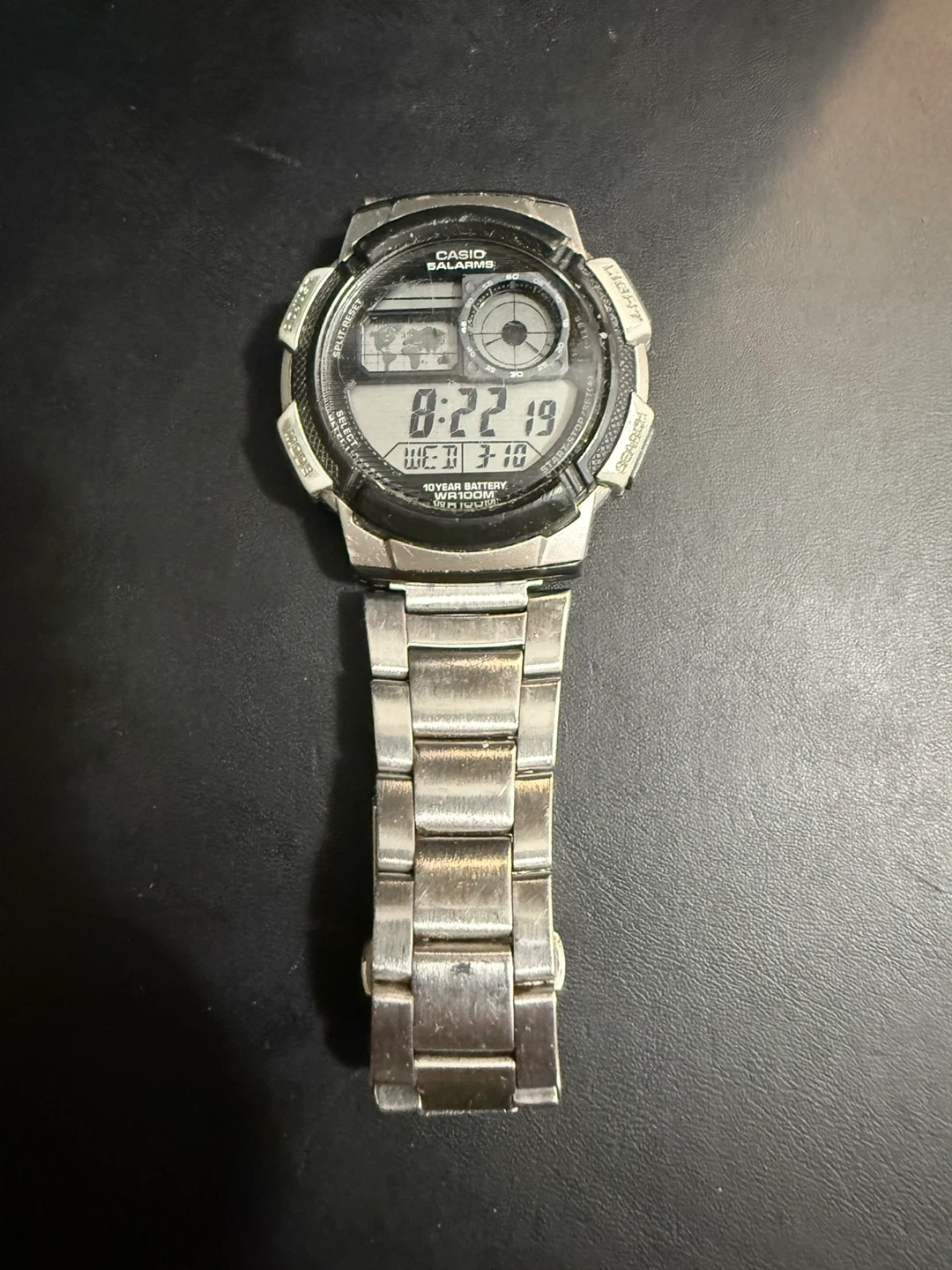 Selling a Casio Alarms WR100M watch. It has a 10 year battery and is water resistant to 100m. There are some scratches on the watch face and band, as shown in the pictures.