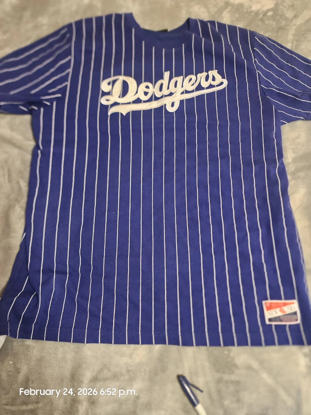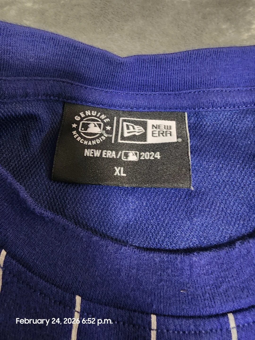 This is a New Era 2024 Los Angeles Dodgers pinstripe jersey in size XL. It's officially licensed MLB merchandise. The fabric is a comfortable blend, perfect for game days or casual wear.