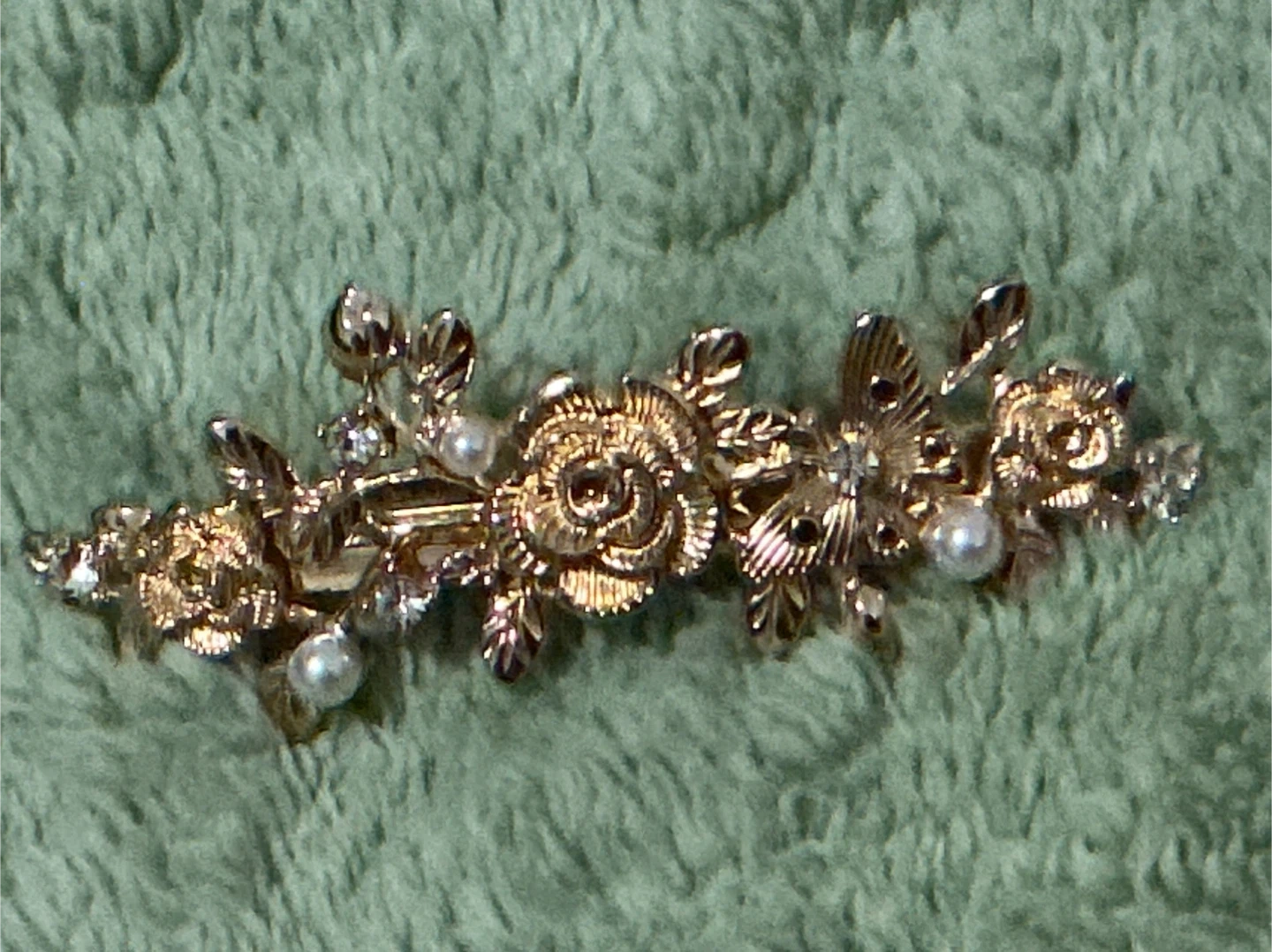 A lovely gold-toned barrette adorned with rose flowers, faux pearls, and sparkling rhinestones. It's a beautiful accessory for adding a touch of elegance to your hairstyle. Perfect for securing hair with style! I wore it once for prom. It’s a lot brighter and gold in person. Looks very new.