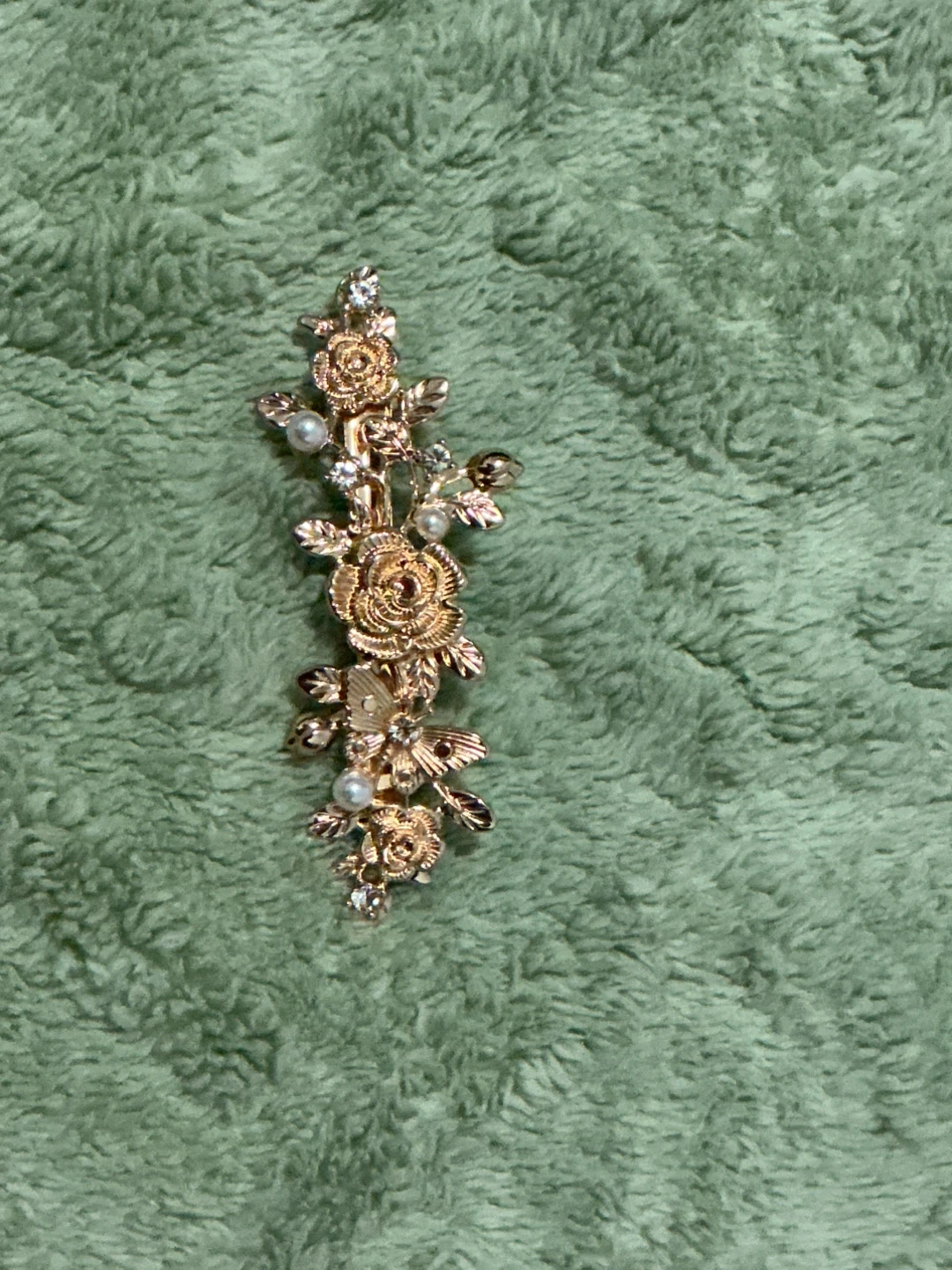 A lovely gold-toned barrette adorned with rose flowers, faux pearls, and sparkling rhinestones. It's a beautiful accessory for adding a touch of elegance to your hairstyle. Perfect for securing hair with style! I wore it once for prom. It’s a lot brighter and gold in person. Looks very new.