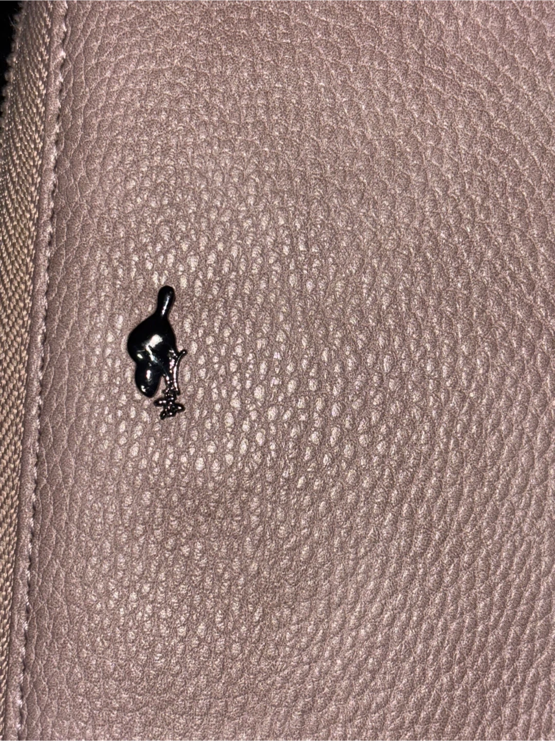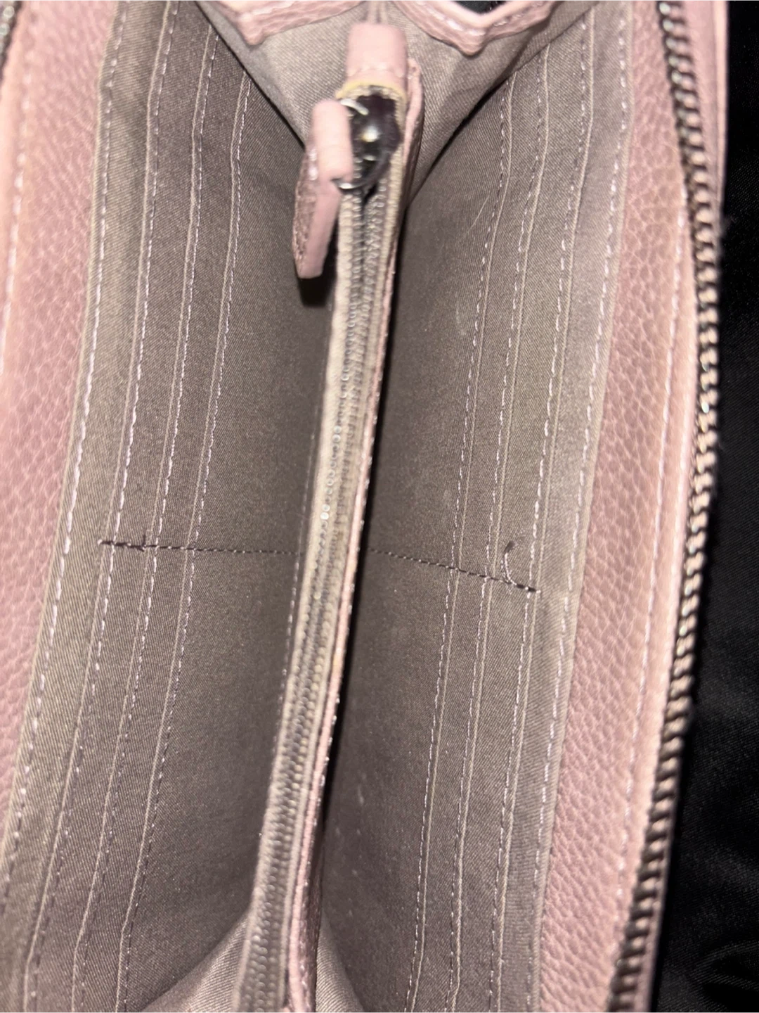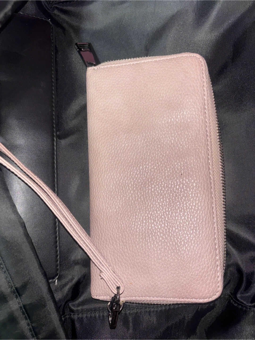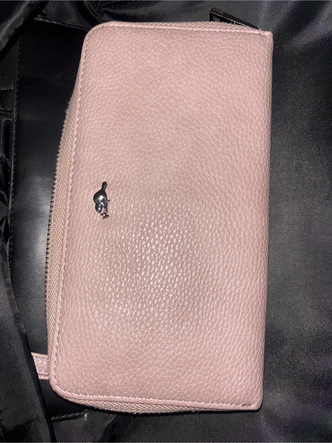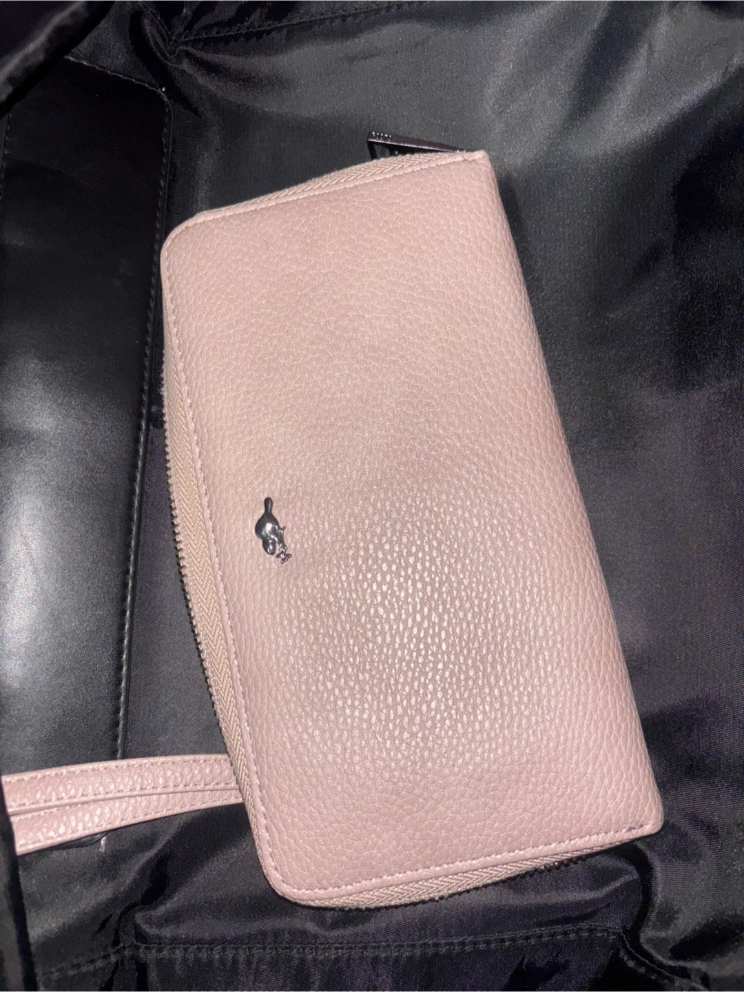 This is a pink leather wristlet wallet with a zip-around closure. It features a small metal charm on the front. Plenty of card slots and compartments inside!