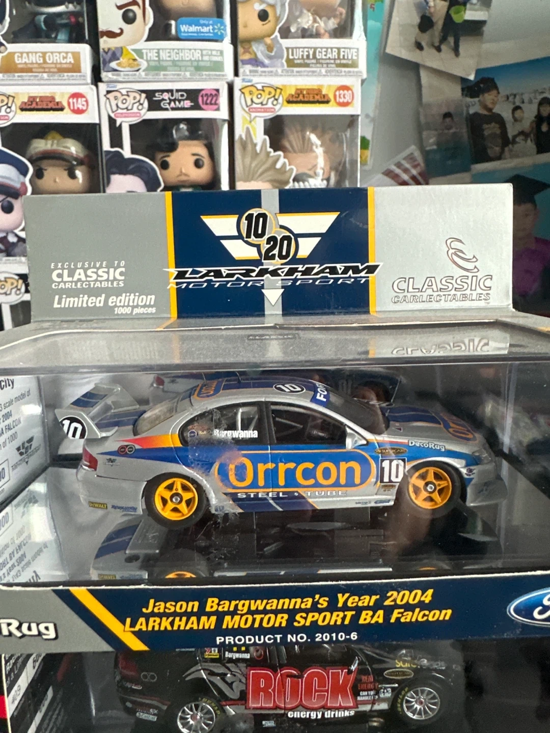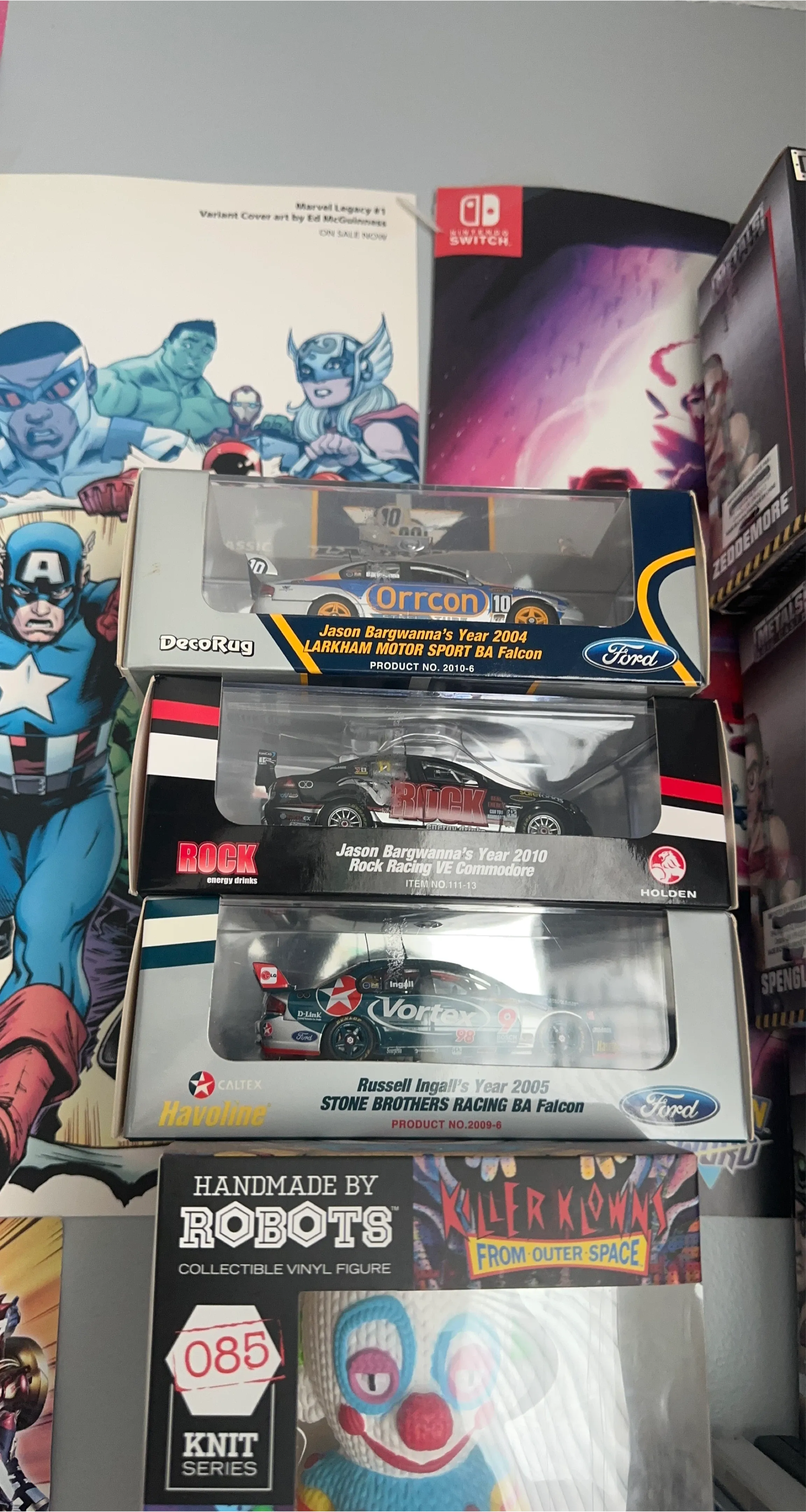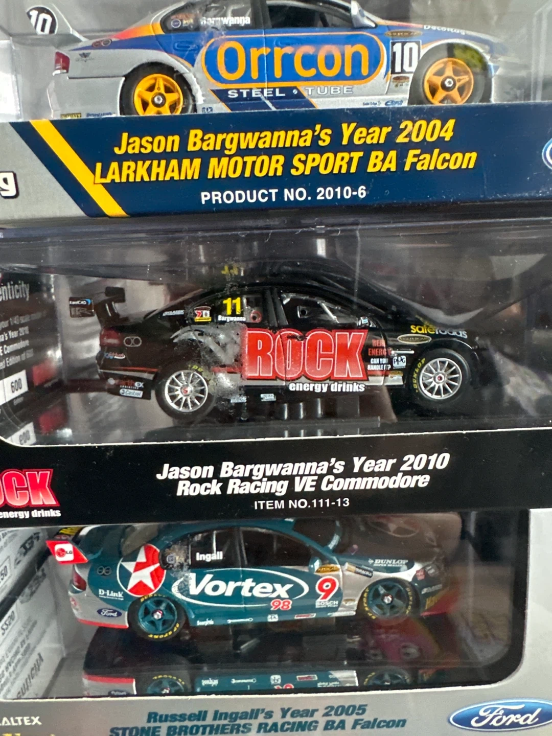 Three 1:43 scale die-cast model race cars. Includes Jason Bargwanna's 2004 Larkham Motor Sport BA Falcon and 2010 Rock Racing VE Commodore. Also includes Russell Ingall's 2005 Stone Brothers Racing BA Falcon. All in original packaging.