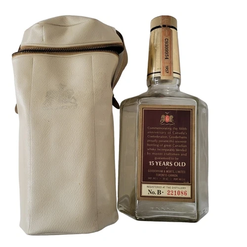 1957 Gooderham's & Worts Canadian Whiskey Bottle Centennial Hexagon shaped + Faux Leather Case.