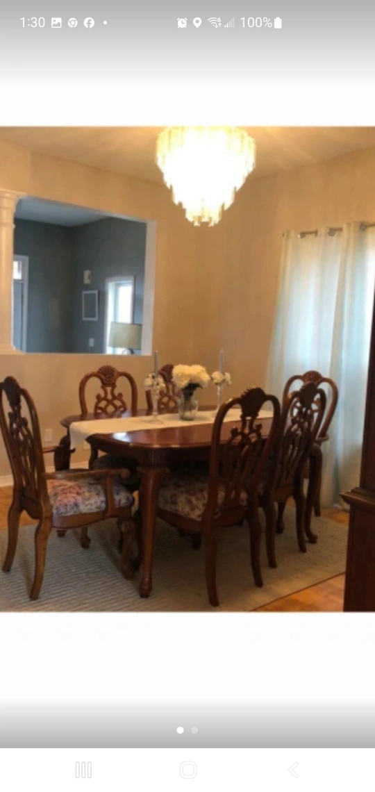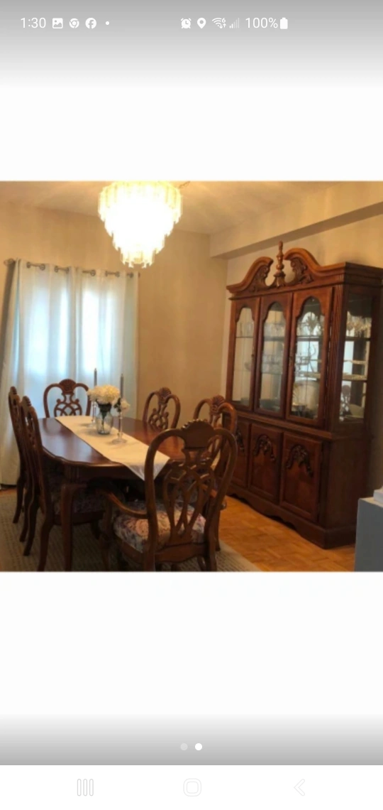 Selling a beautiful dining table set that includes six chairs and a matching hutch. This set would be perfect for a dining room or large kitchen. It's in great condition and ready for a new home!