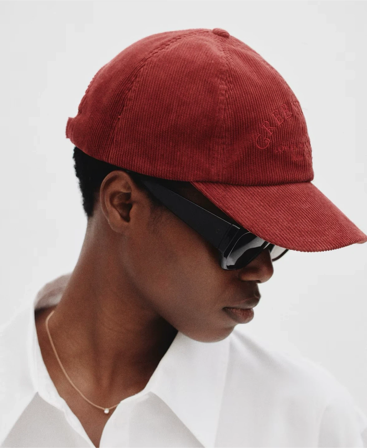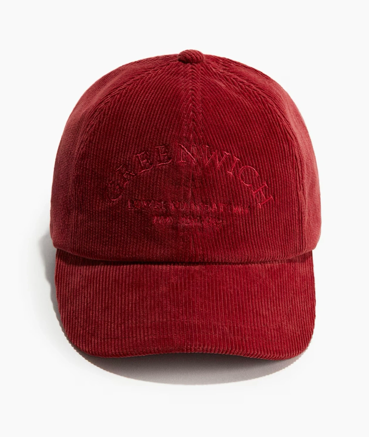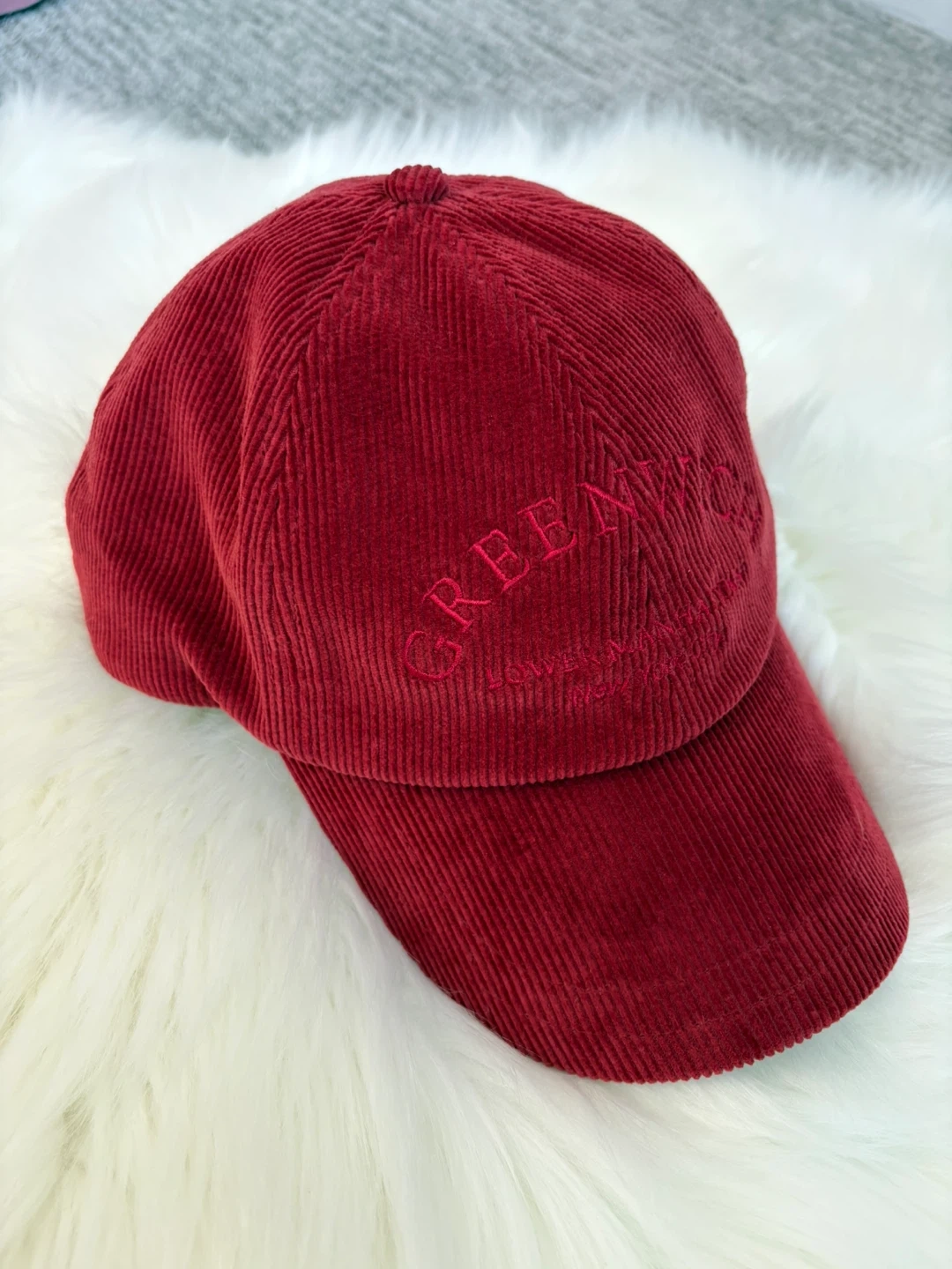 A stylish red corduroy baseball cap with 'Greenwich' embroidery. It's made with soft corduroy fabric. This cap is great for casual wear!