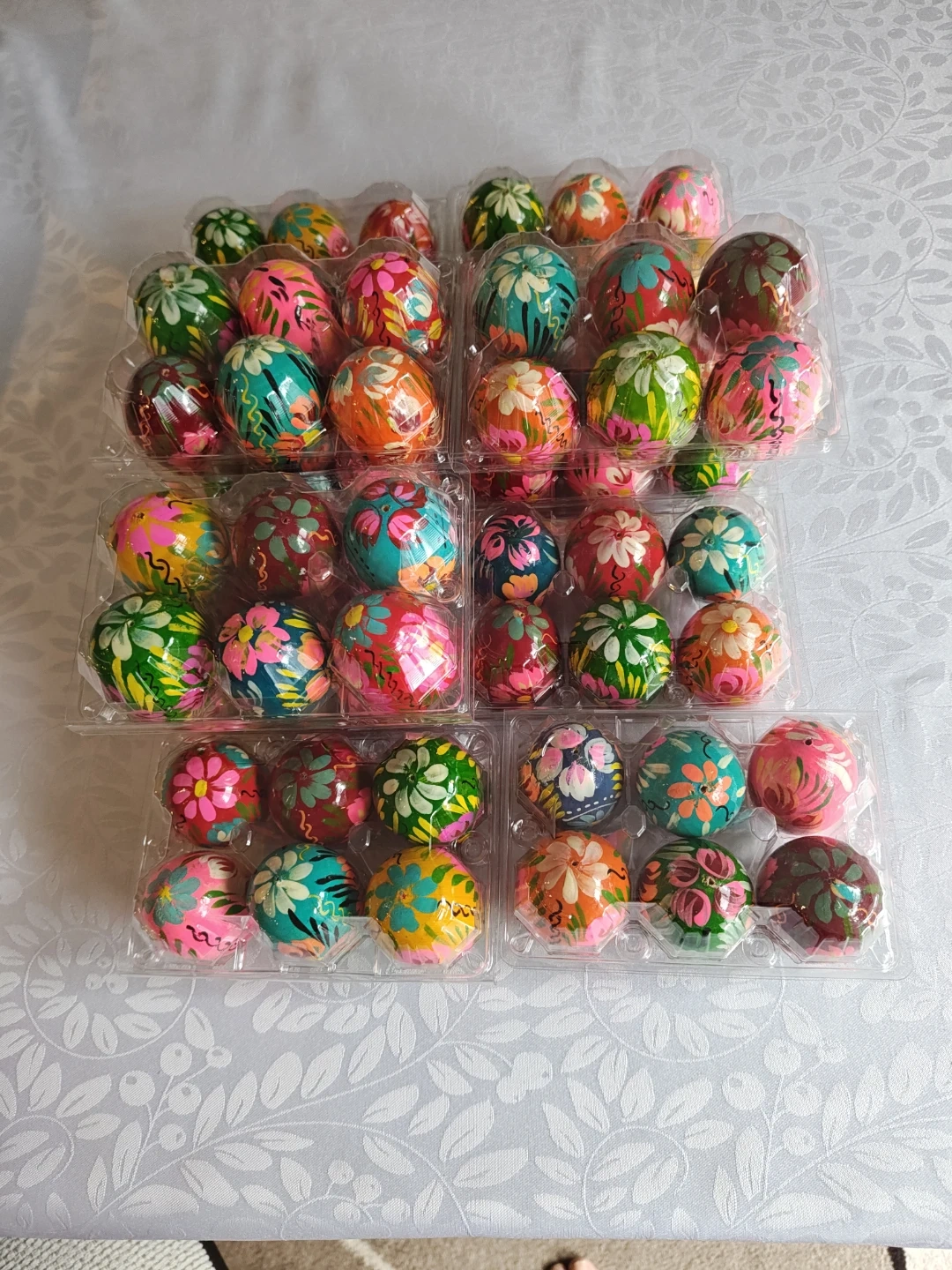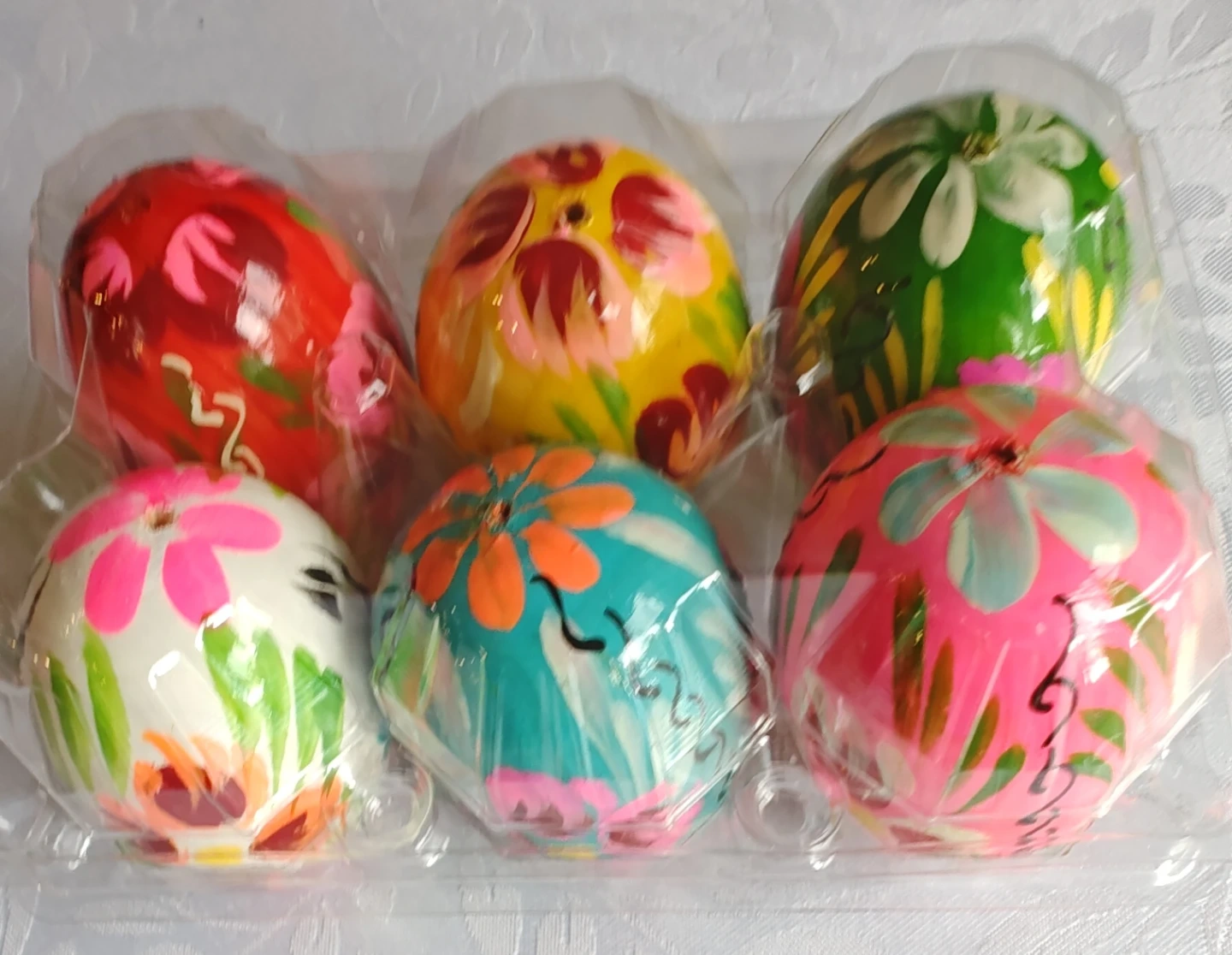 These are six beautifully hand-painted decorative Easter eggs, each with unique floral designs. They come in a clear plastic tray for display. These eggs add a festive touch to any spring or Easter decor!