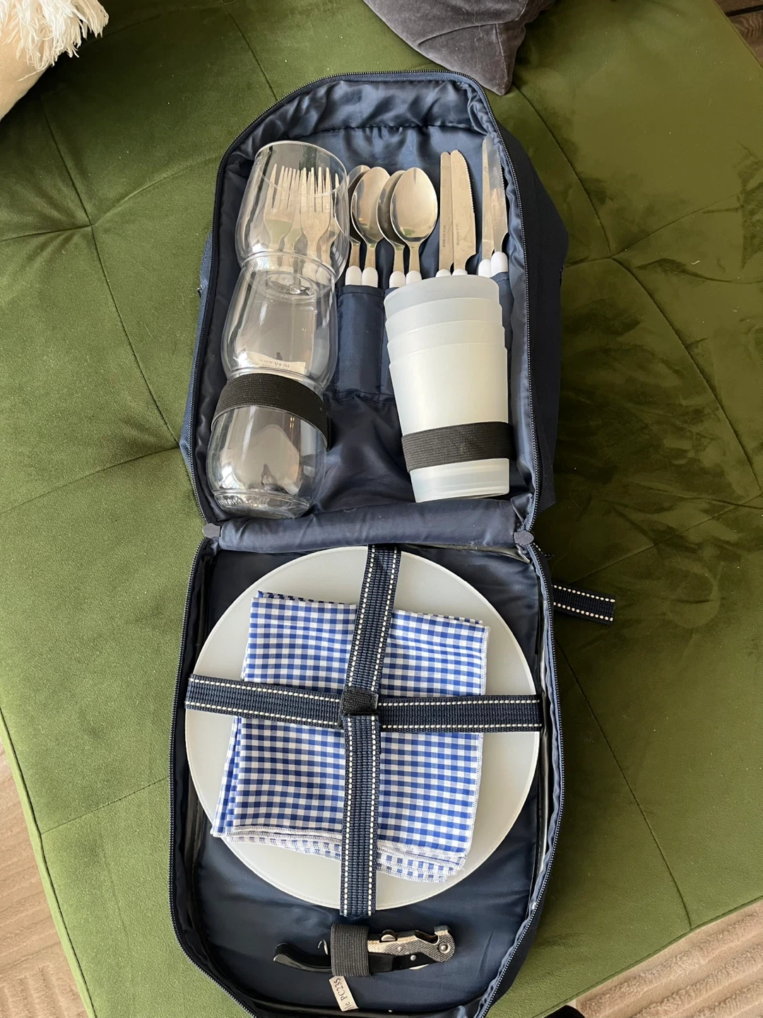 Includes plates, cutlery, glasses, cups, napkins, and a corkscrew. The backpack has adjustable straps.