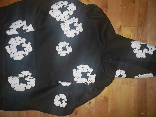 Elevate your streetwear game with this striking Denim Tears hoodie, featuring a unique floral design. The hoodie is used, but still in great condition. It's a medium size, perfect for a comfortable fit. Specifications: Brand: Denim Tears, Size: Medium, Colour: Black with white floral graphics, Material: Cotton Blend. If the ad's up, it's available!