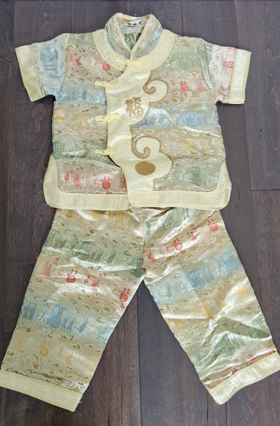 Traditional Chinese toddler unisex outfit. Pale yellow/gold with colourful embroidered details. Includes matching top and pants.