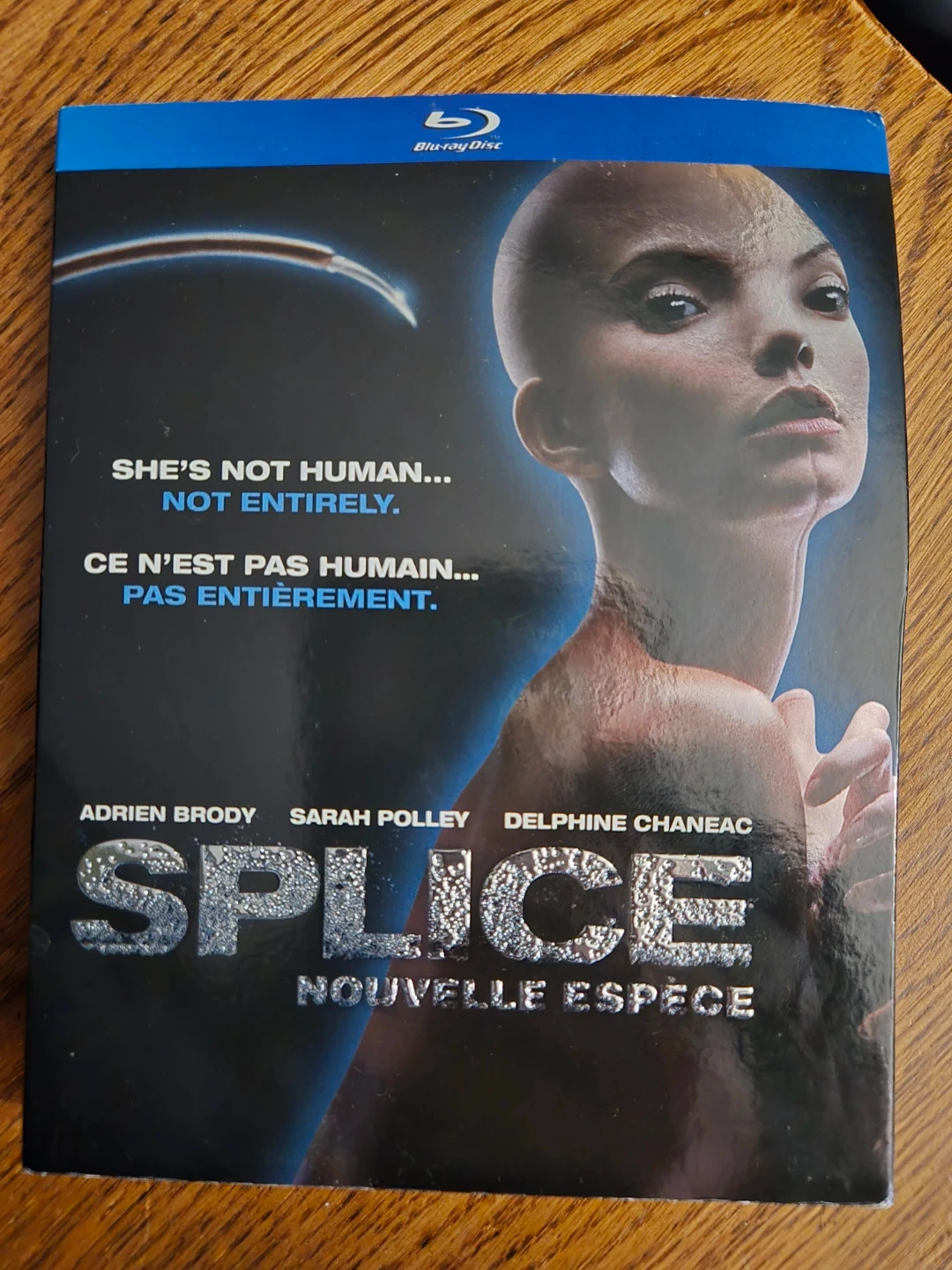 This is the Splice Blu-ray Disc. It features Adrien Brody, Sarah Polley, and Delphine Chaneac. The movie is about a scientist duo creating a new hybrid species.