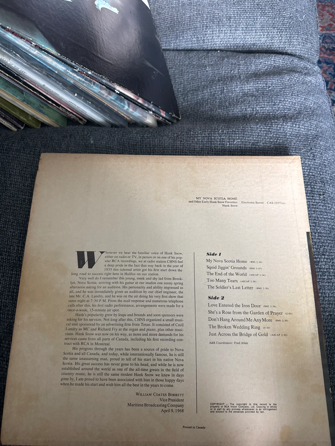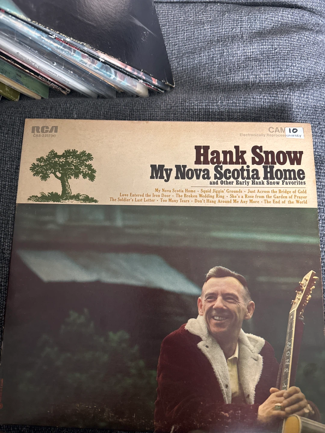 Hank Snow's "My Nova Scotia Home" vinyl record, featuring other early Hank Snow favorites. This album includes tracks like "Love Entered the Iron Door" and "The Soldier's Last Letter." A classic country music collection from 1968.