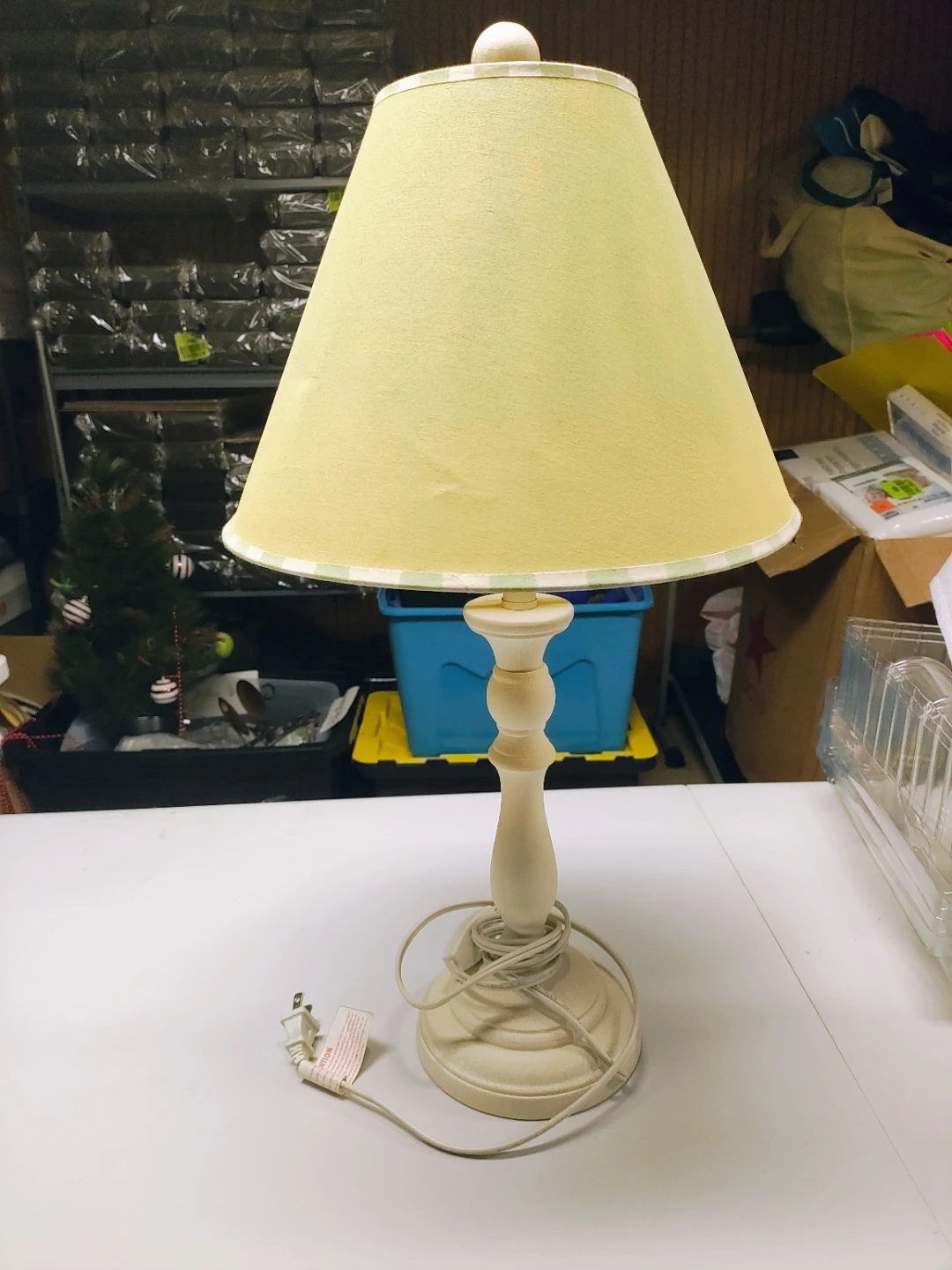 This table lamp features a cream-colored base with a decorative spindle design. It's topped with a light yellow/green cone-shaped lampshade with a subtle checkered trim. This lamp is perfect for adding a touch of soft lighting to any room! Approximately 23" tall.