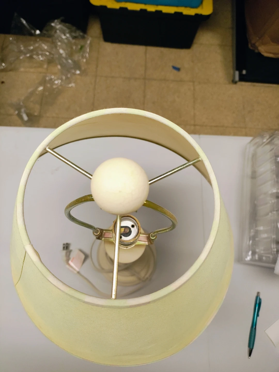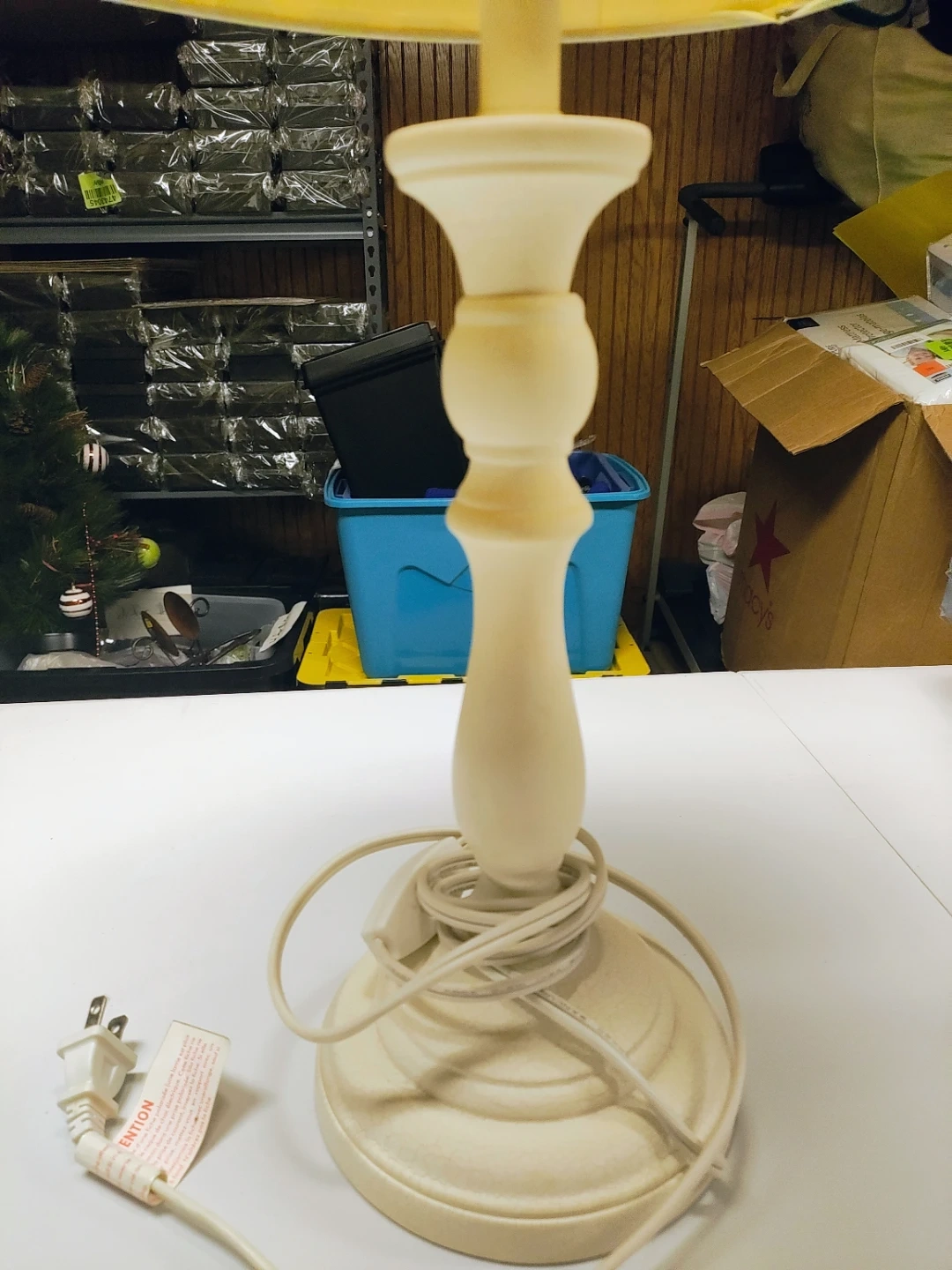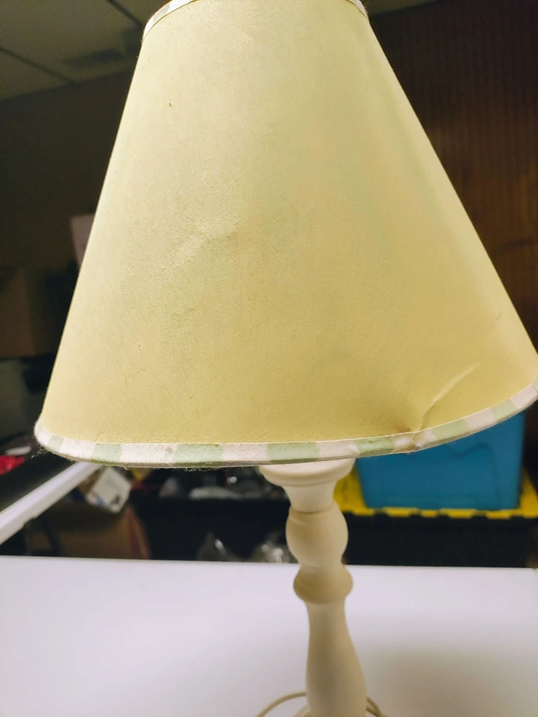 This table lamp features a cream-colored base with a decorative spindle design. It's topped with a light yellow/green cone-shaped lampshade with a subtle checkered trim. This lamp is perfect for adding a touch of soft lighting to any room! Approximately 23" tall.