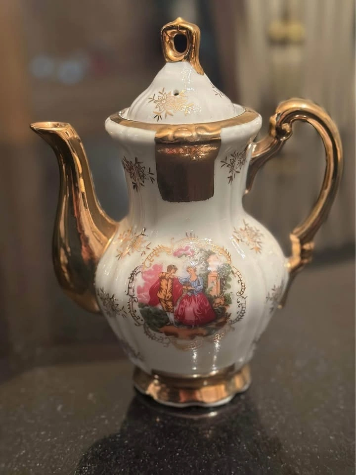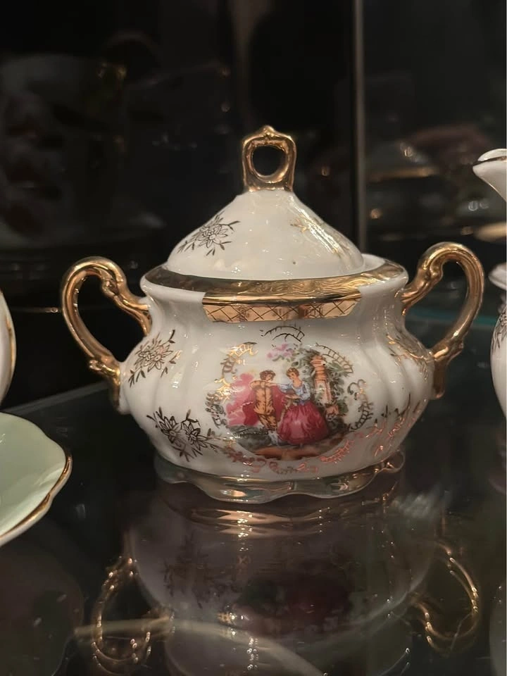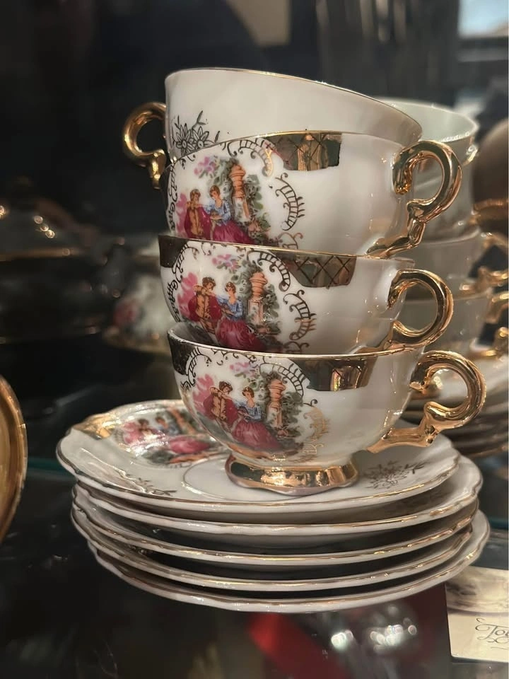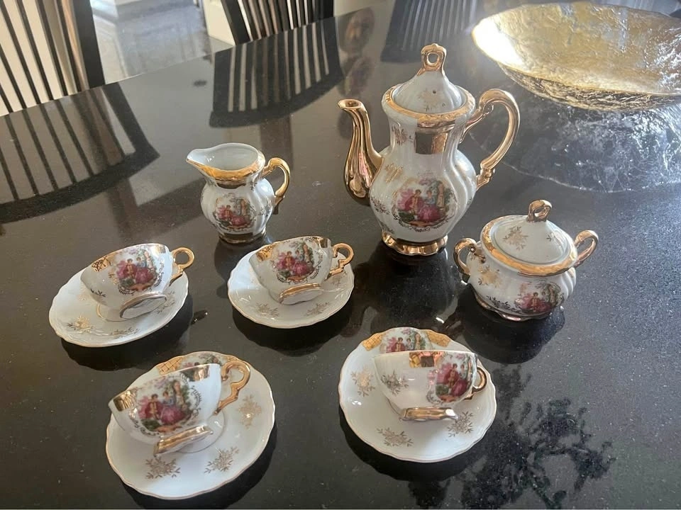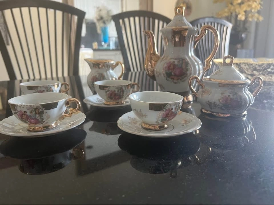 This is a vintage tea set made in Japan. The set includes a teapot, creamer, sugar bowl, and four teacups with saucers. The pieces feature a delicate floral and romantic scene design, depicting a scene of a courting couple in Victorian attire, with gold trim accents. It is made of porcelain.