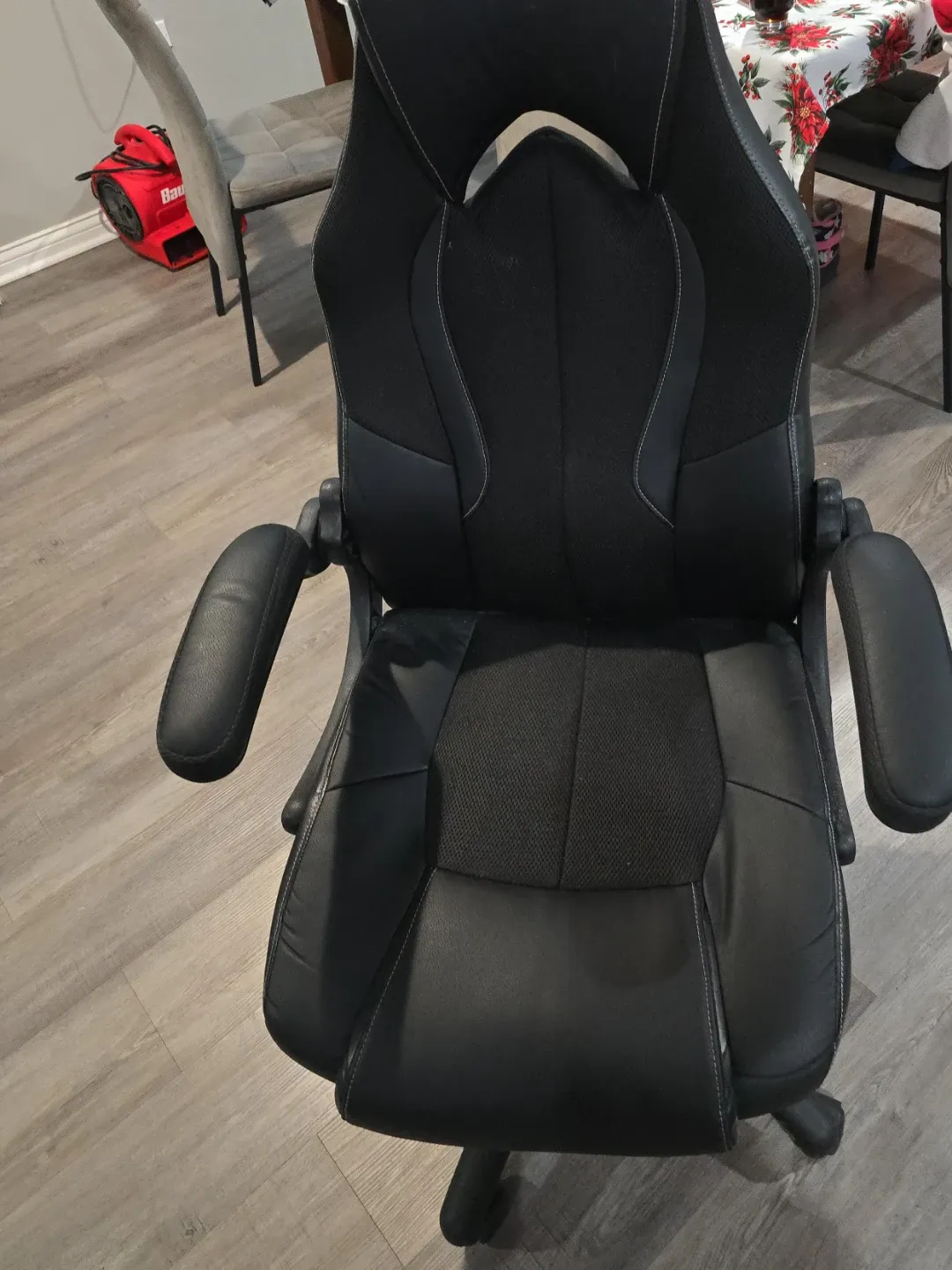 Selling a black gaming chair. It's in good condition and ready for a new gamer! The chair features a high back design and padded armrests for comfortable support during long gaming sessions. It also has a swivel base for easy movement.