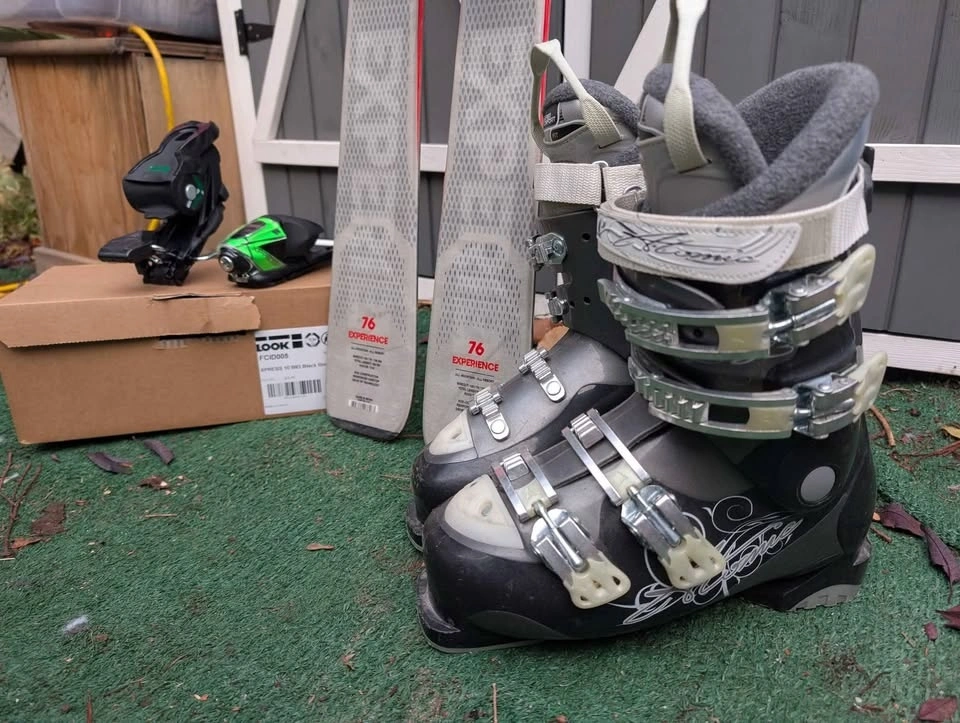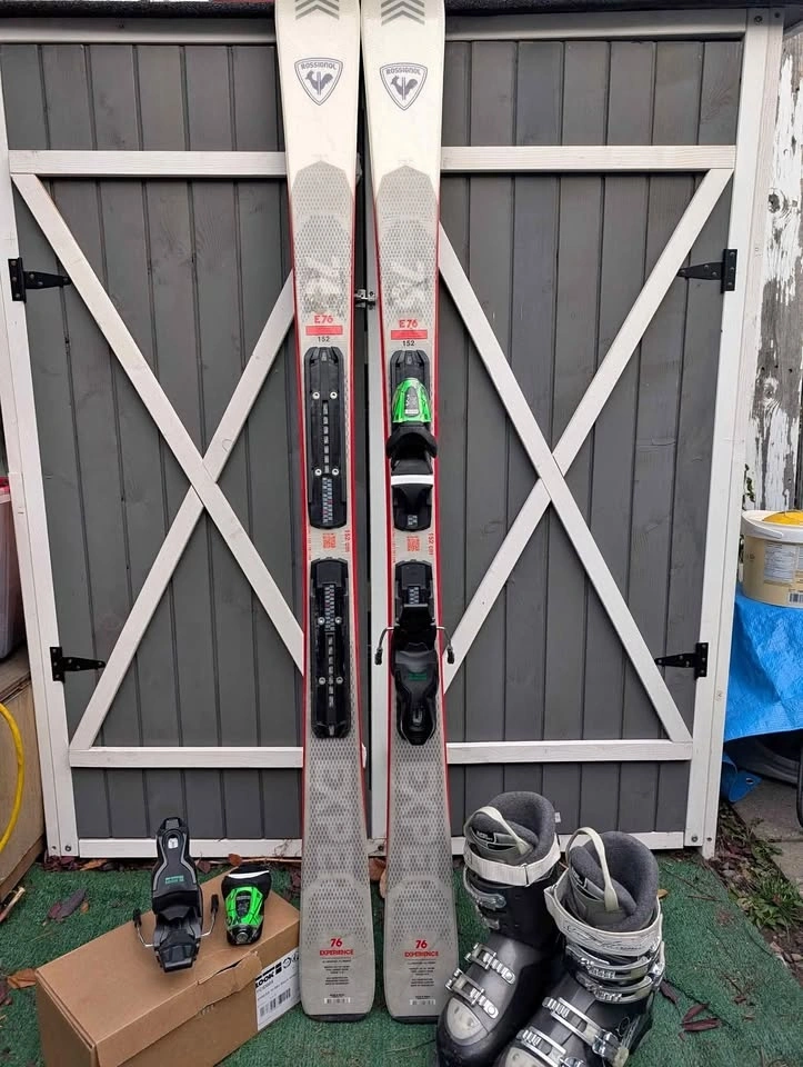 Rossignol E76 / 152cm skis. No issues with skis & bases. NEW - Green Look ski bindings. Atomic 24.5 ski boots - fits size 6-7.