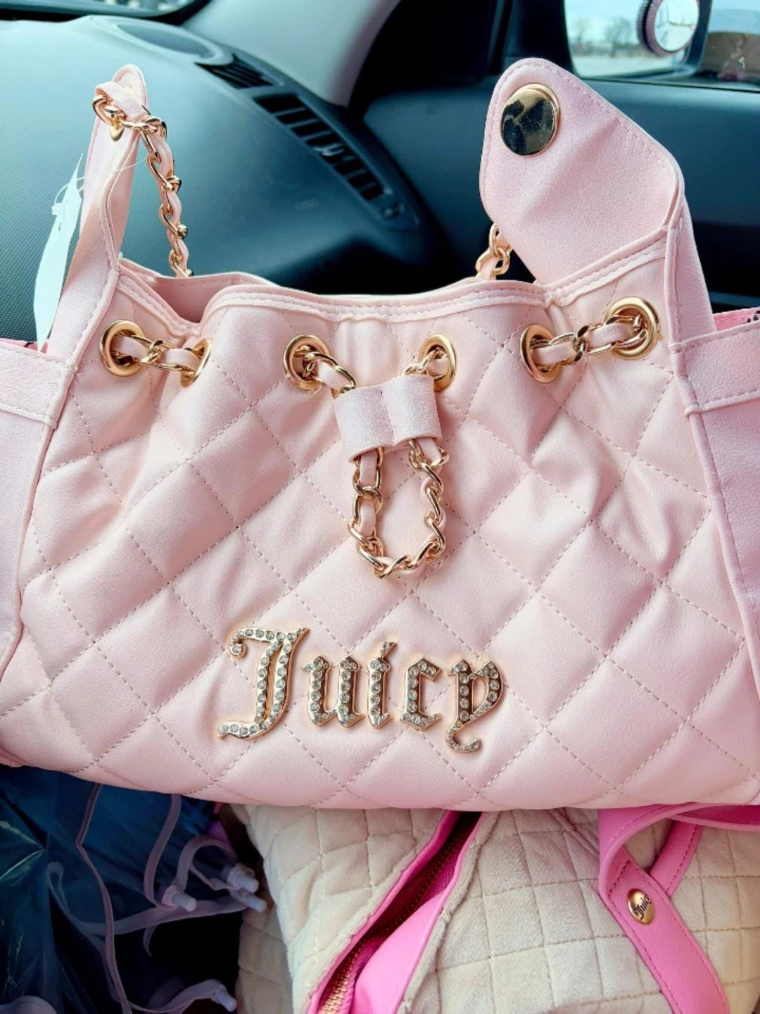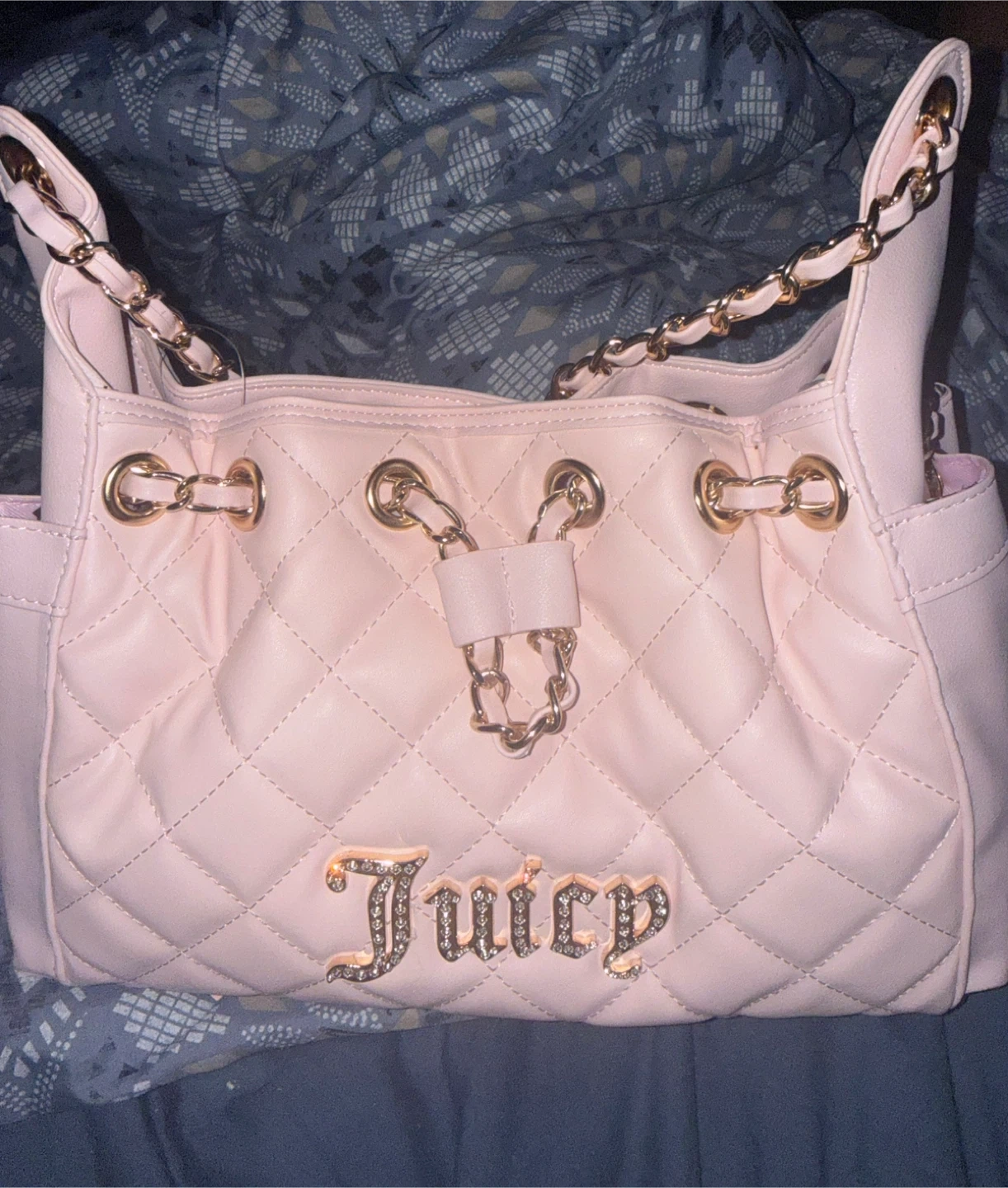 This pink Juicy Couture handbag features a diamond-stitched quilted design. It has gold chain detailing and a drawstring closure. The "Juicy" logo is embellished with rhinestones.