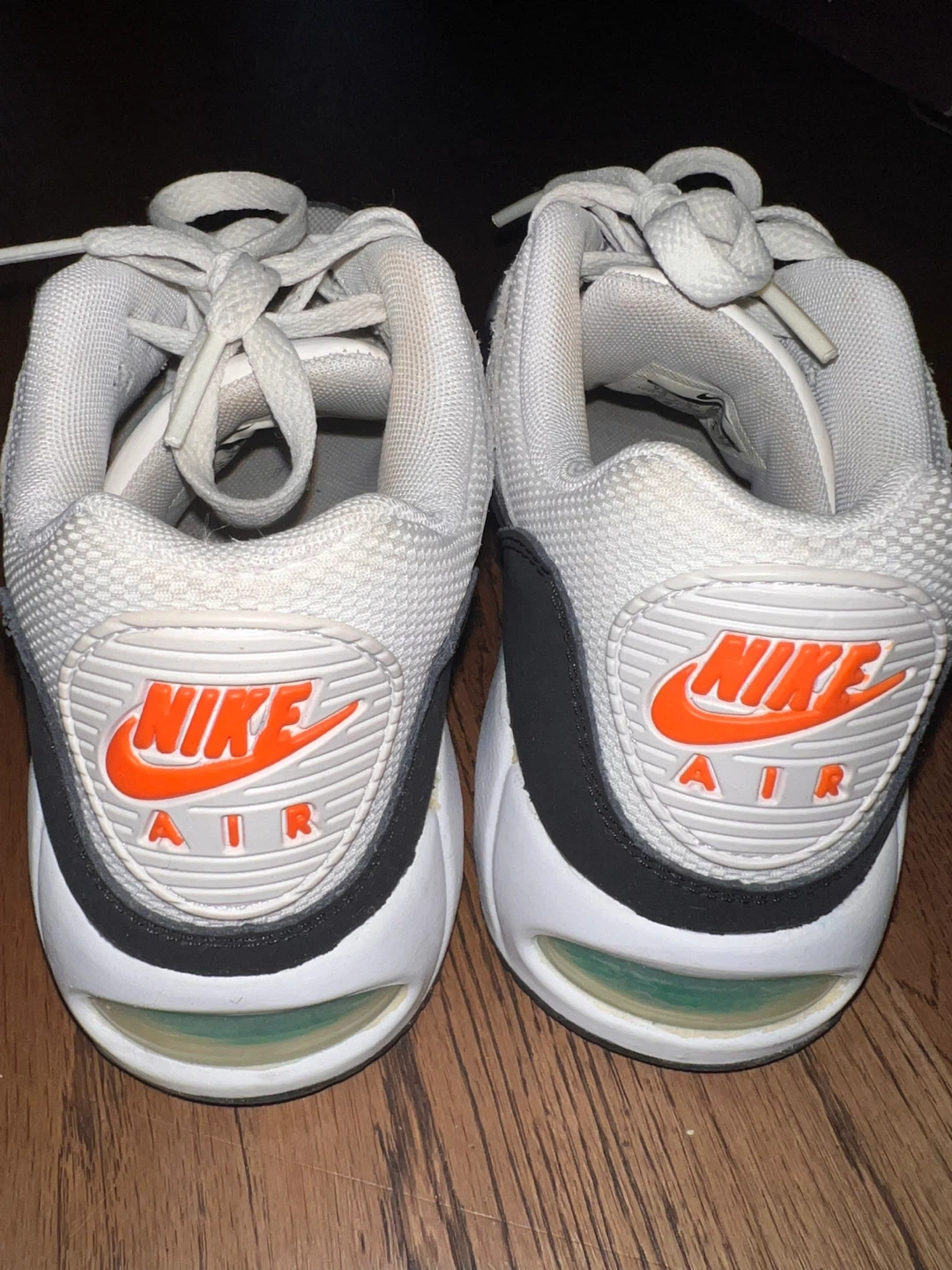 Women's Nike Air Max Correlate sneakers in white, black, and coral. Features a comfortable air sole unit. These shoes are great for everyday wear or light athletic activities.
