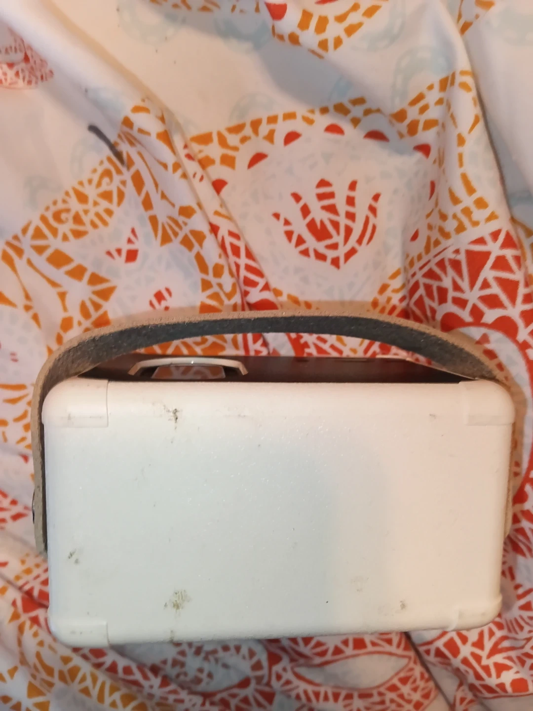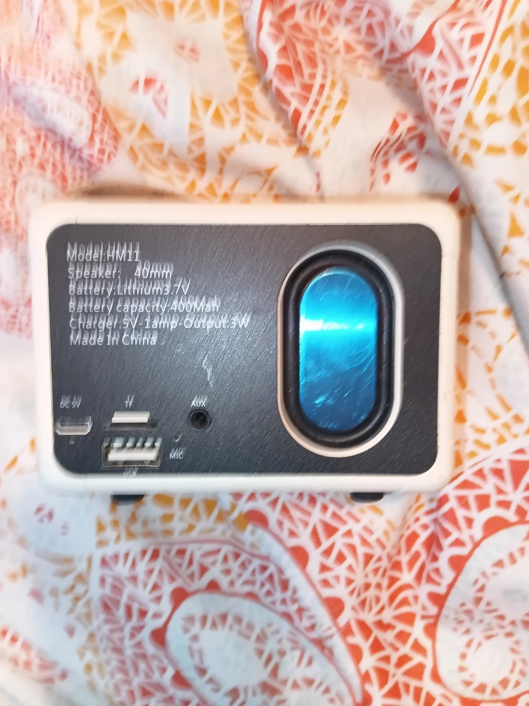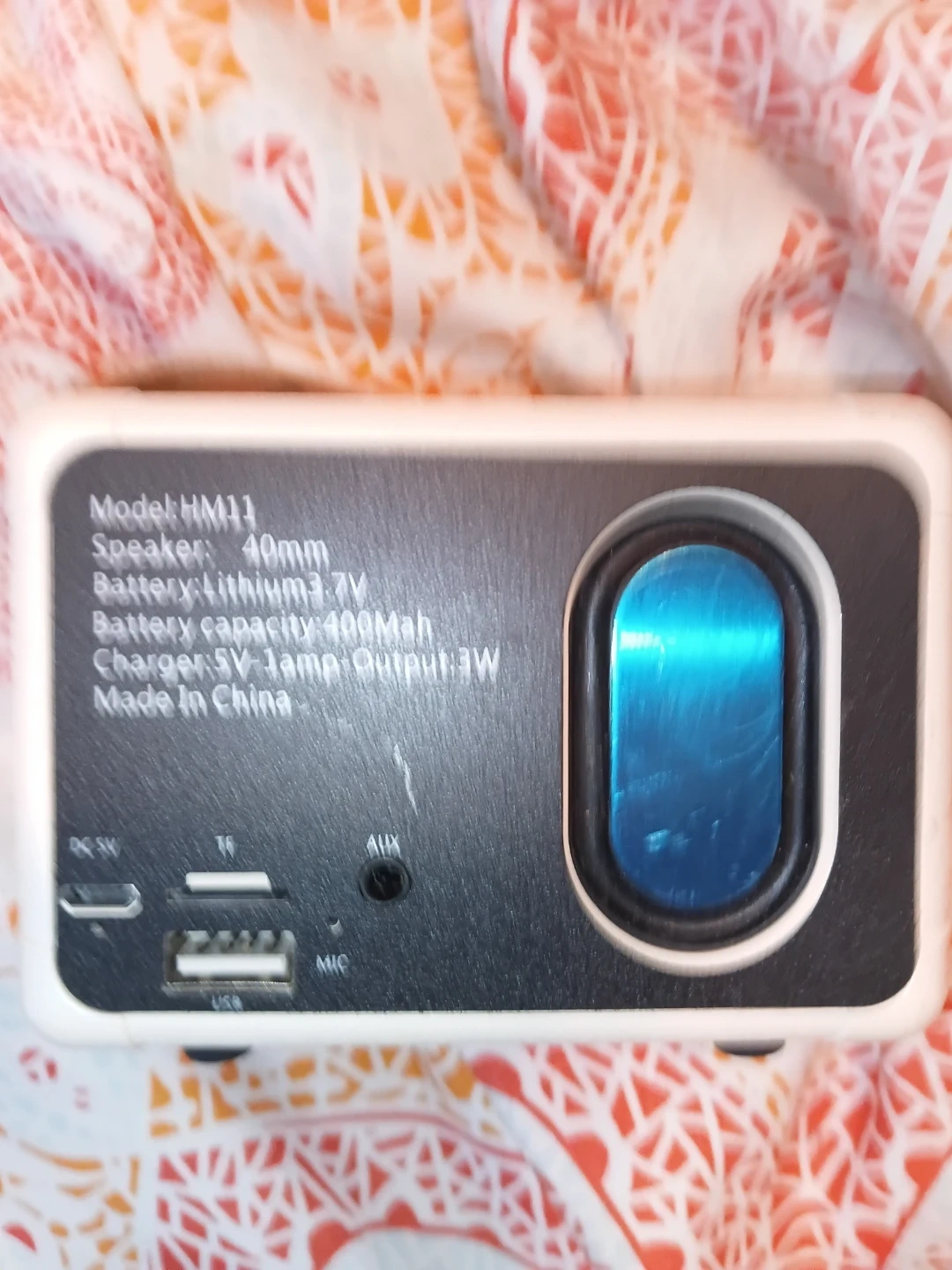 This portable speaker features a 40mm speaker and a 400mAh lithium battery. It has a charger input of 5V 1A and an output of 3W. An AUX input is available for additional connectivity.