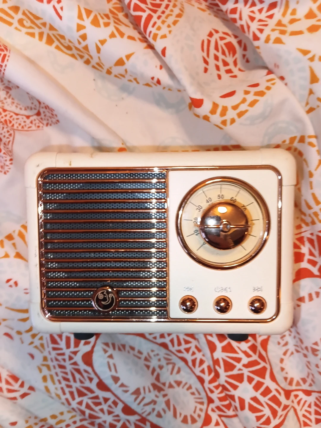 This portable speaker features a 40mm speaker and a 400mAh lithium battery. It has a charger input of 5V 1A and an output of 3W. An AUX input is available for additional connectivity.