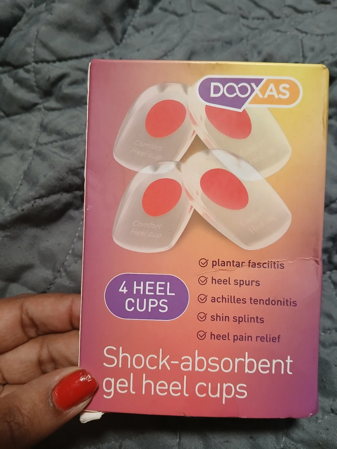 These are DOOXAS shock-absorbent gel heel cups. They're designed for comfort and pain relief from conditions like plantar fasciitis and heel spurs. Gel material provides cushioning. Price is firm plz. Pick up midland and Danforth or 401 bay street or stc mall