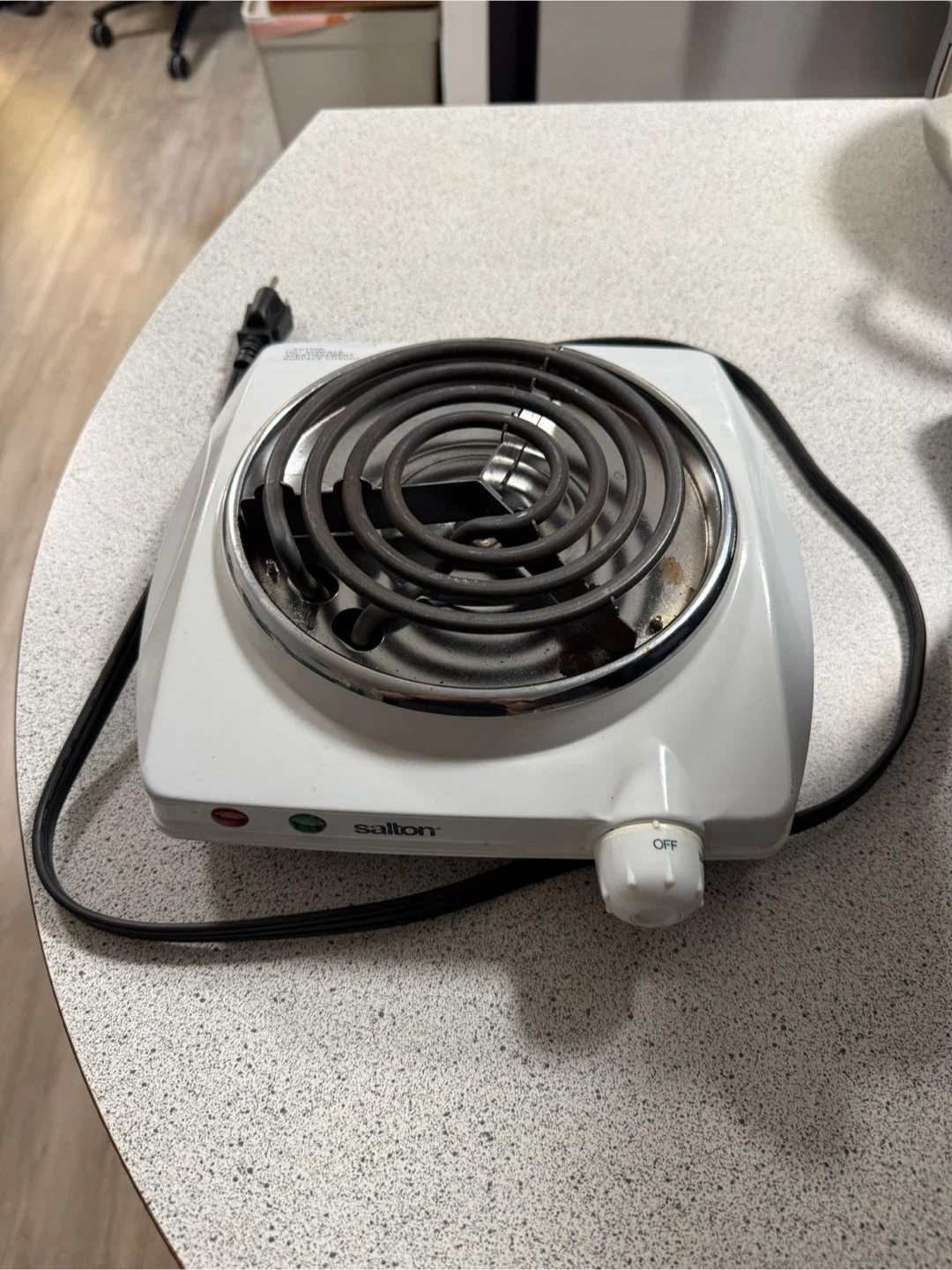 This is a Salton single electric burner with a coil heating element. It features indicator lights and a temperature control dial. The burner is white and comes with a power cord.