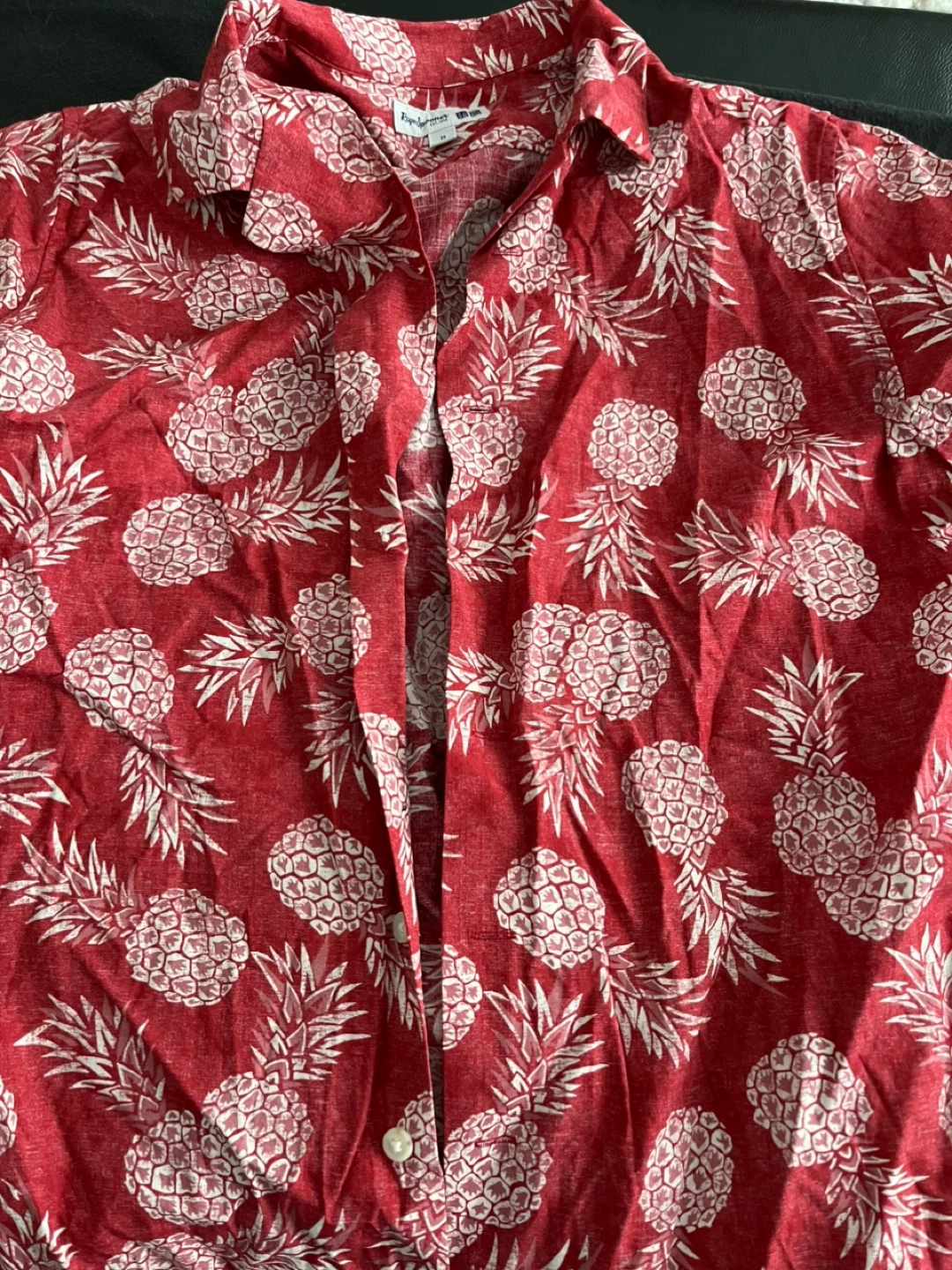 This is a fun red button-up shirt with a white pineapple pattern. It's a short-sleeved, collared style. Perfect for warm weather occasions! Cotton