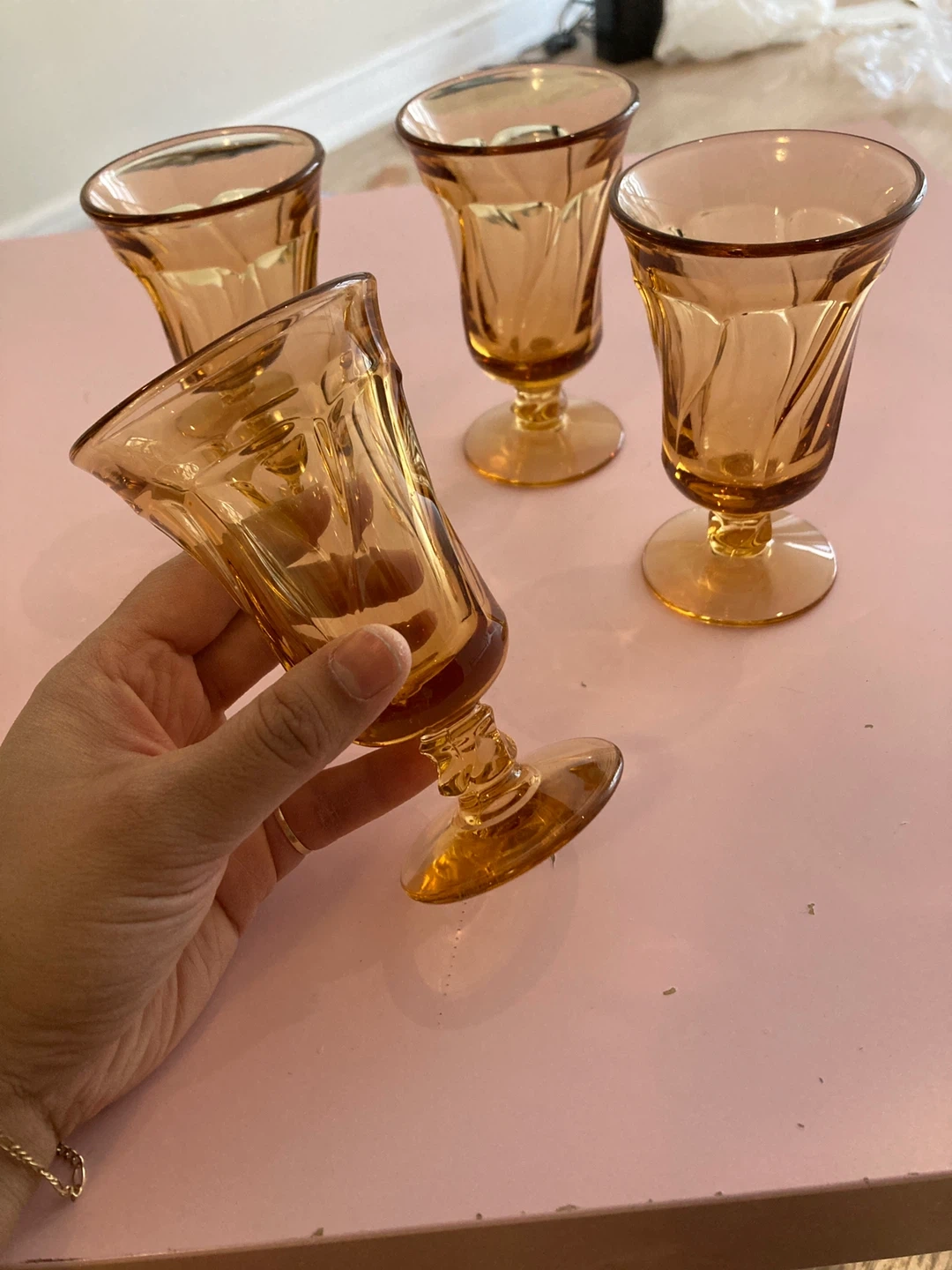 This is a set of four amber-coloured glass goblets. They're made of clear glass with a swirling pattern. These goblets are perfect for serving drinks at special occasions.