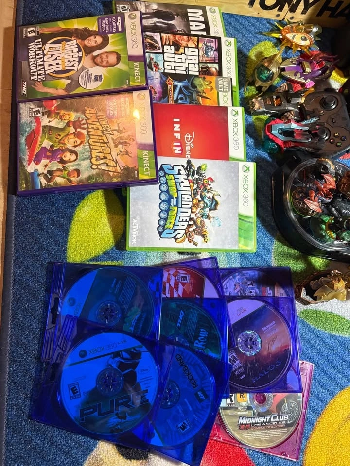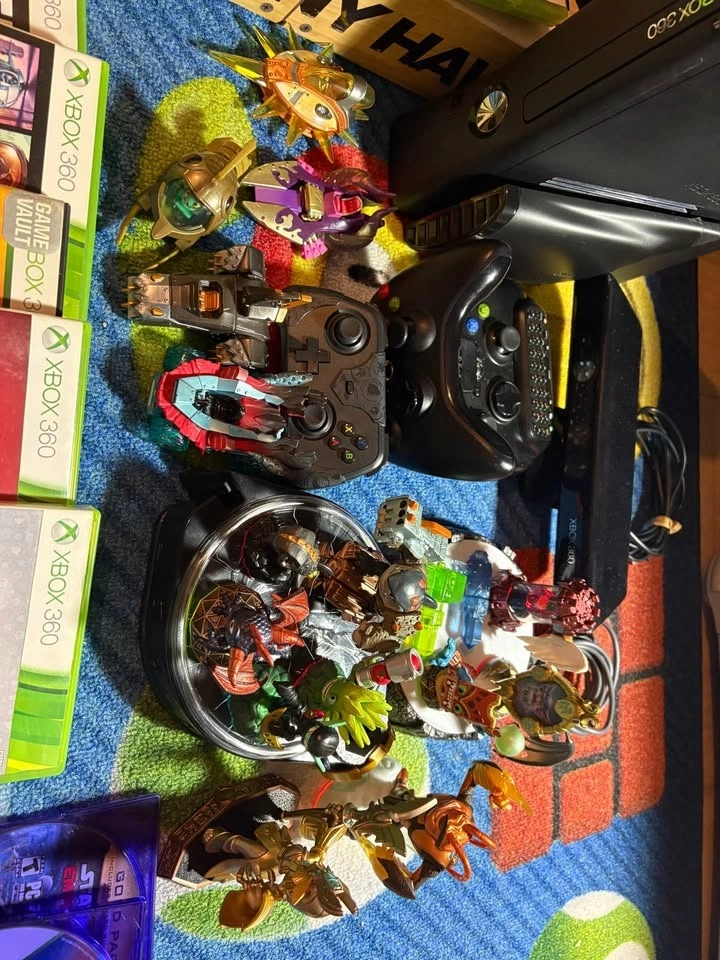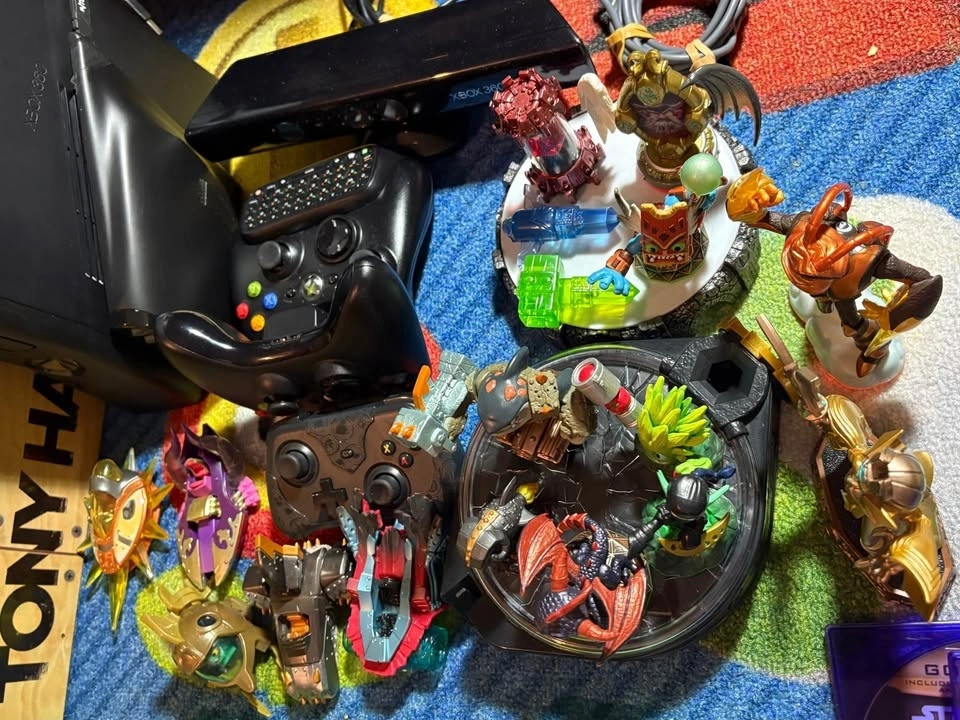 Includes Xbox 360 console with 2 controllers, Kinect sensor, Skylanders portal with figures, Tony Hawk skateboard and games, and power supply. Make an offer!