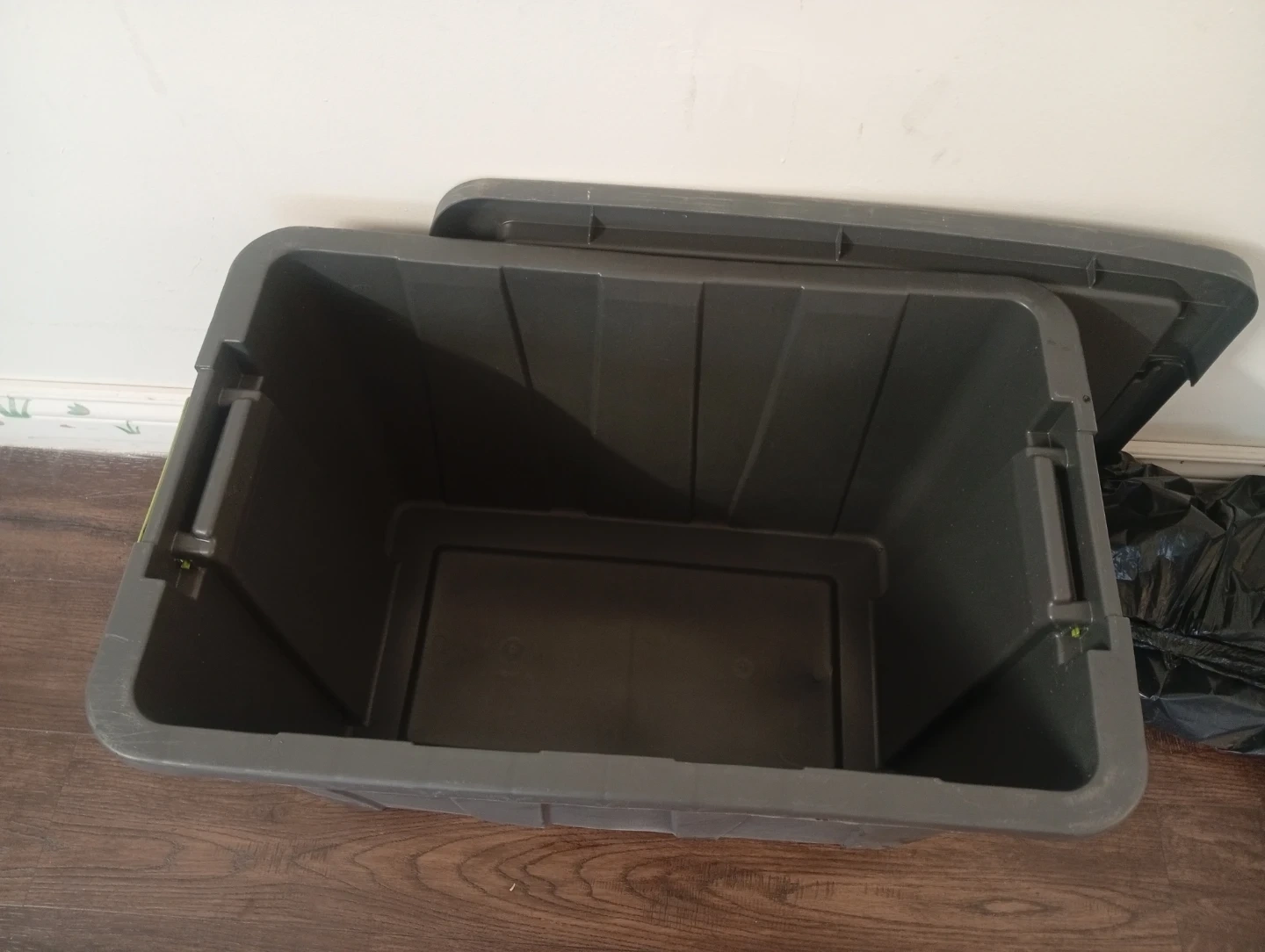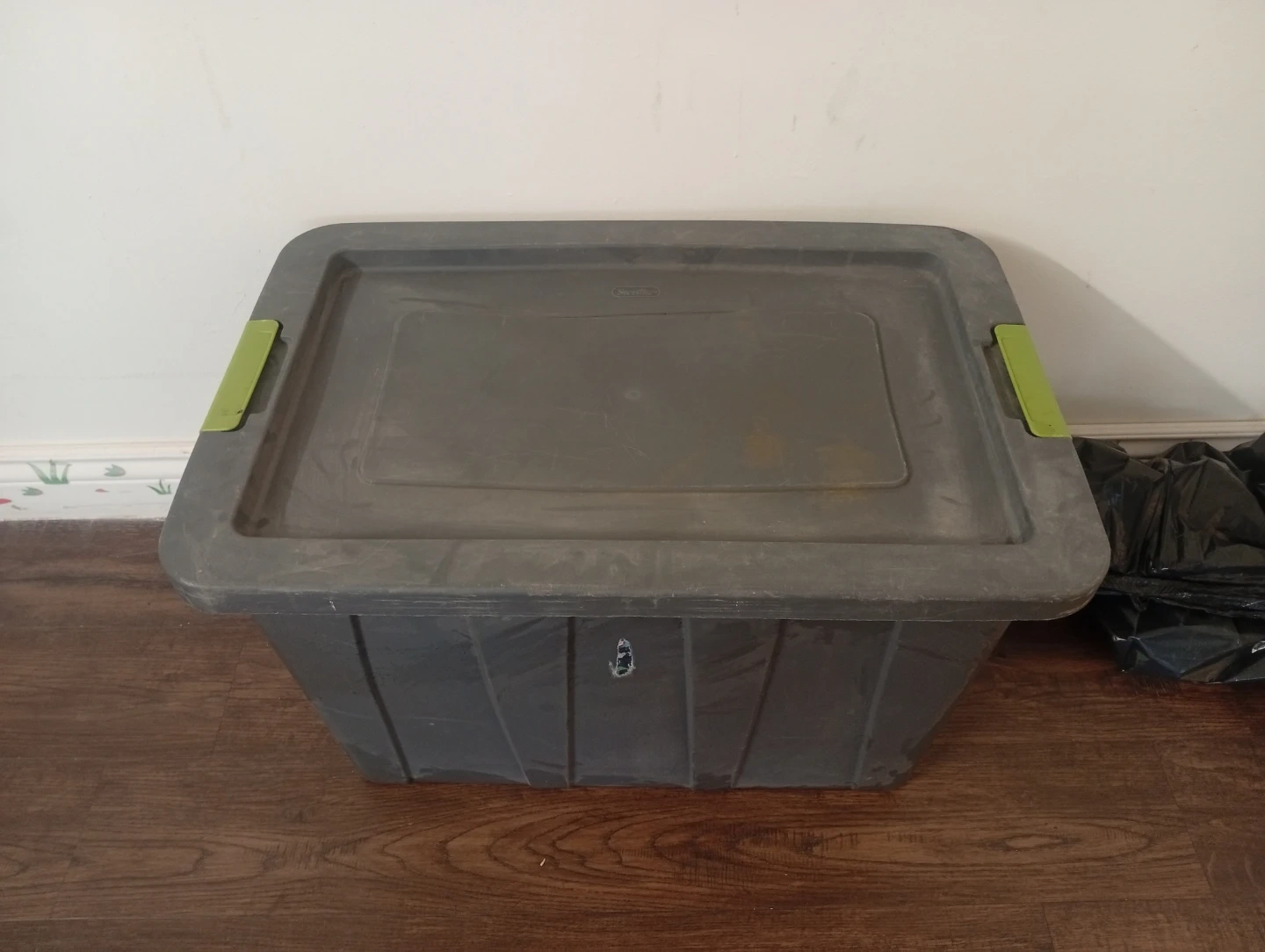 This is a grey plastic storage bin with a lid. It has green latches to secure the lid. The bin is empty and ready for use. Great for organizing your home!