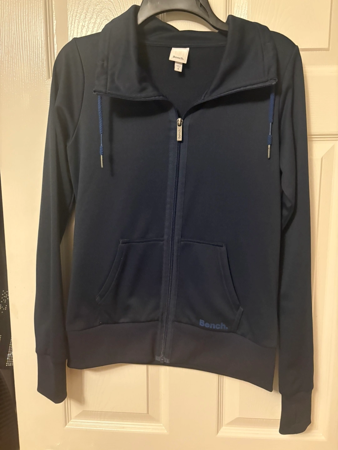 Navy blue zip-up hoodie. Long sleeves. Small brand logo on the bottom. Drawstrings on the hood. Never worn Pat and smoke free home.