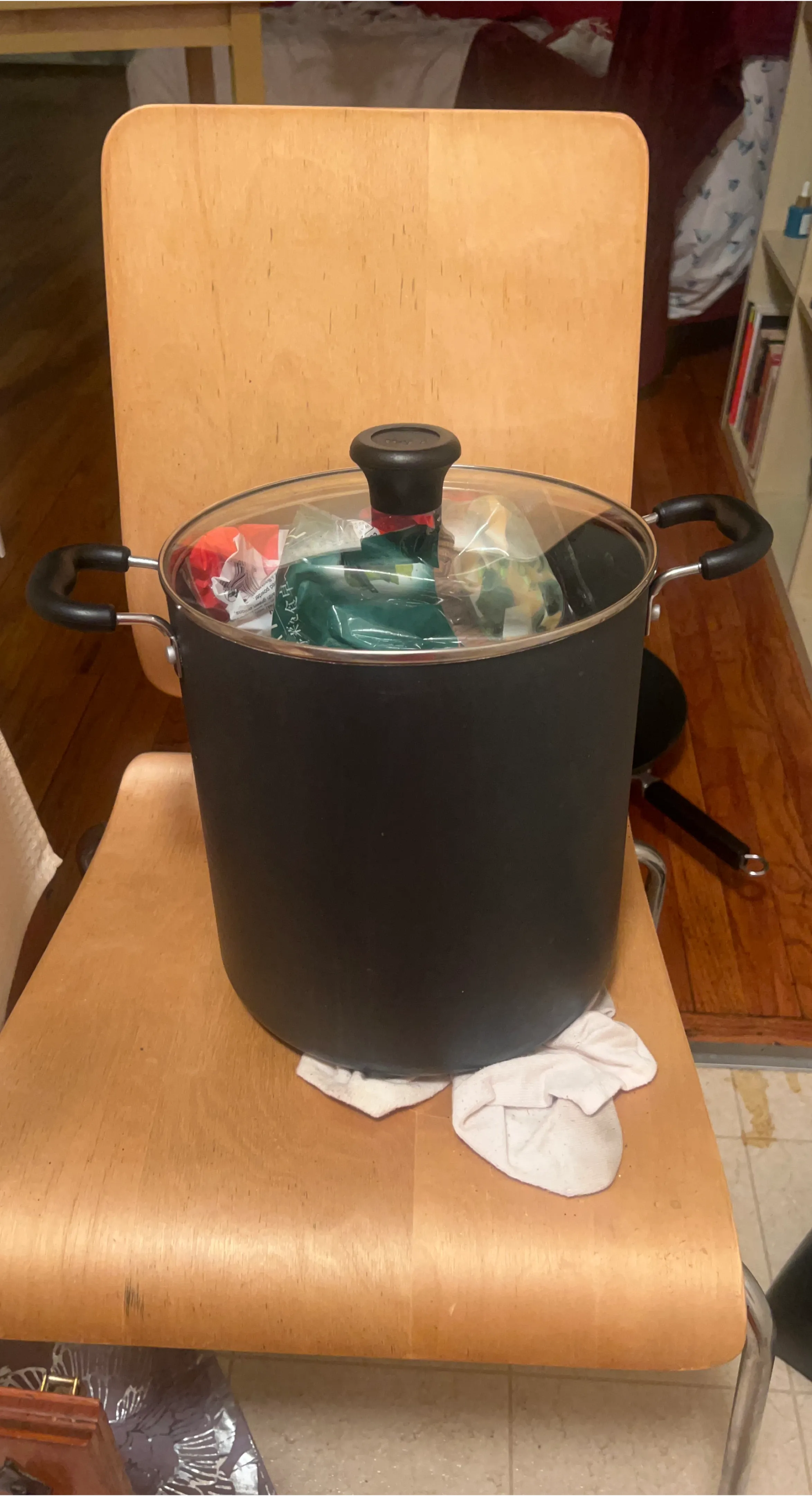 This is a large stock pot, perfect for making soups or stews. It has a black exterior and comes with a clear glass lid with a black handle. The pot features two sturdy side handles for easy carrying. It's made from durable material for long-lasting use.