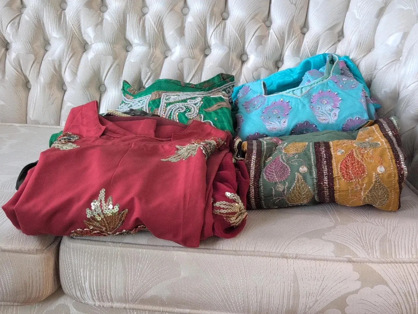 Four beautiful Indian women's outfits. Includes embroidered tops and bottoms in vibrant colours like red, blue, and green. Perfect for festive occasions or cultural events!