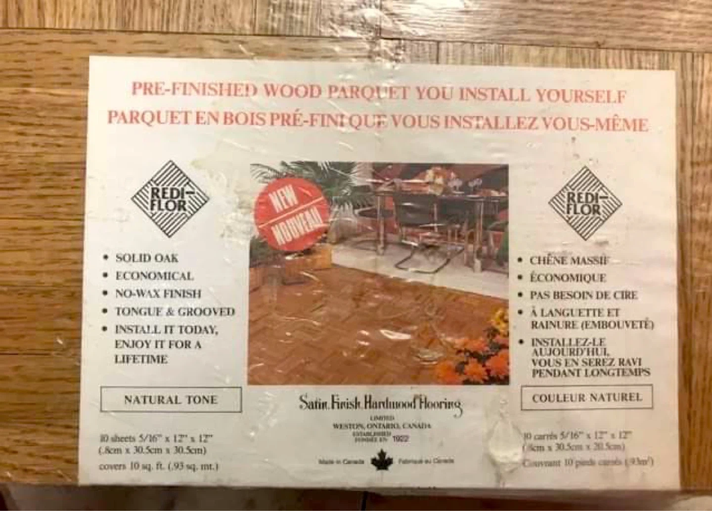 Selling Bloc-Flor pre-finished wood parquet in natural tone. Each package contains 10 sheets of solid oak, measuring 5/16" x 12" x 12" (8cm x 30.5cm x 30.5cm), covering 10 sq ft. The wood is economical, tongue & grooved, and has a no-wax finish. Install it today and enjoy it for a lifetime! I have 8 packs available, and each pack comes with 10 sheets. So 80 sheets total