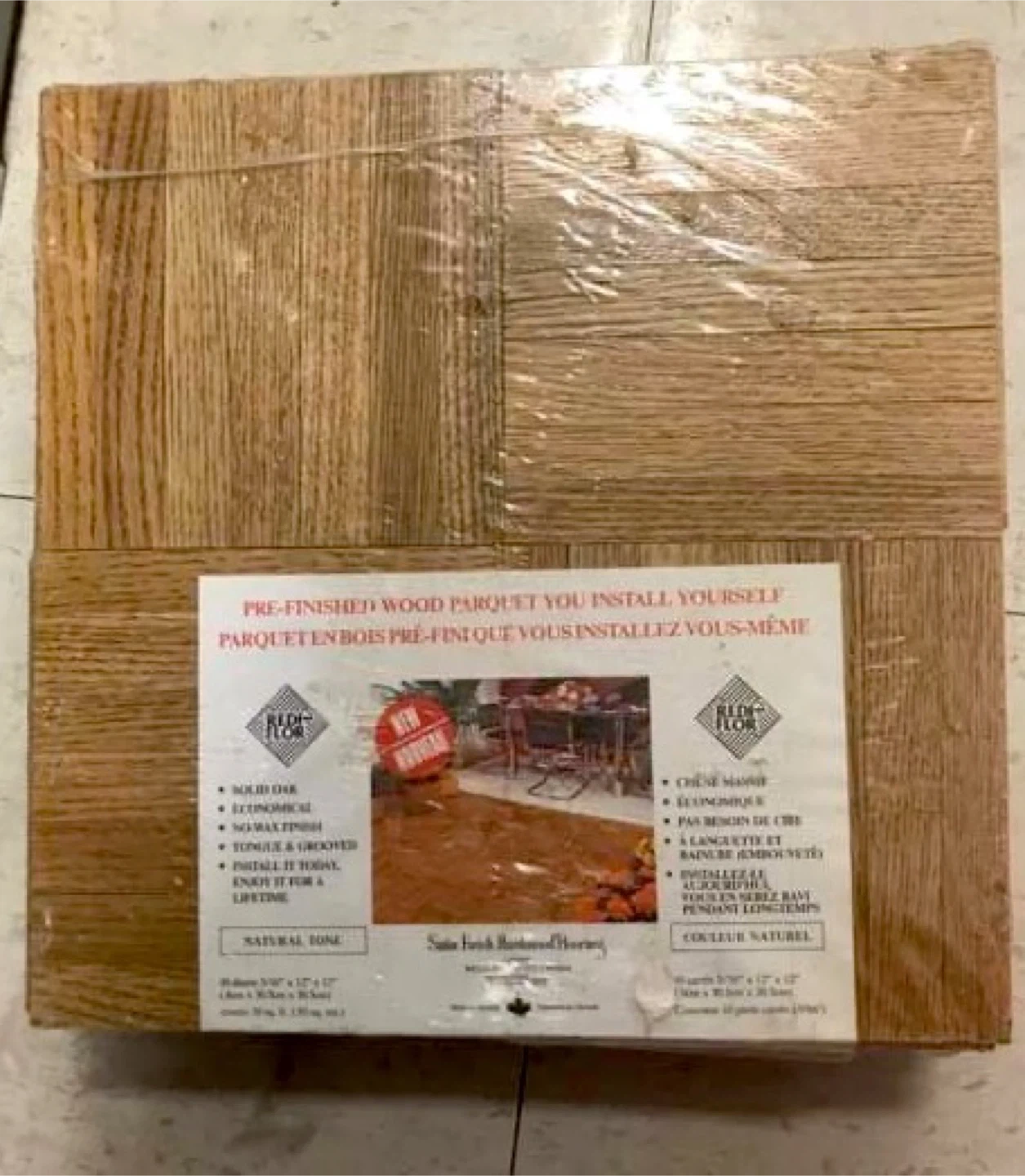 Selling Bloc-Flor pre-finished wood parquet in natural tone. Each package contains 10 sheets of solid oak, measuring 5/16" x 12" x 12" (8cm x 30.5cm x 30.5cm), covering 10 sq ft. The wood is economical, tongue & grooved, and has a no-wax finish. Install it today and enjoy it for a lifetime! I have 8 packs available, and each pack comes with 10 sheets. So 80 sheets total